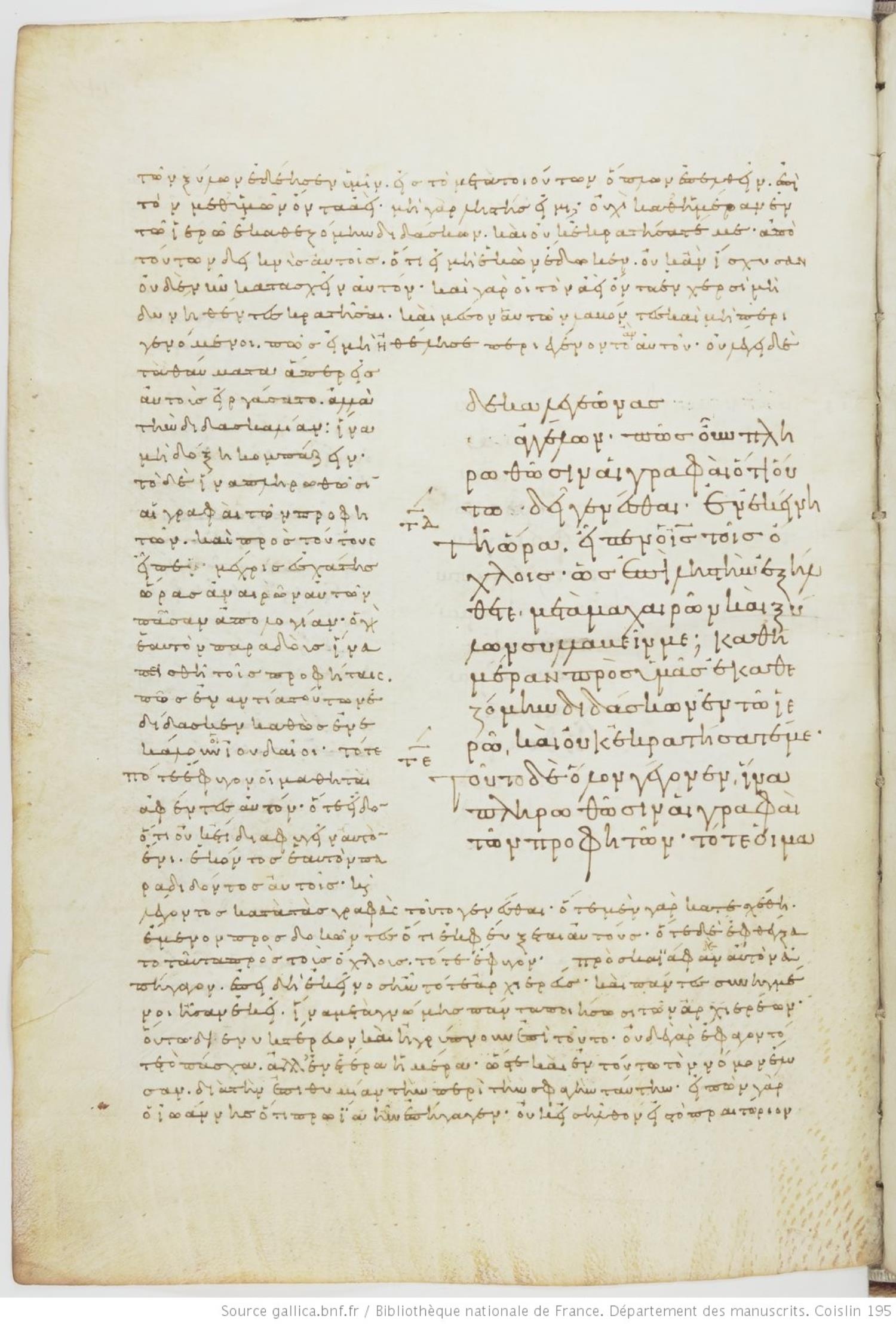 Tenth-century minuscule of the Gospels with commentary on parchment; 469 leaves, 1 column, varying number of lines per column. Images are made available by the Bilbiothèque Nationale. For recent images, please visit BNF Gallica.
