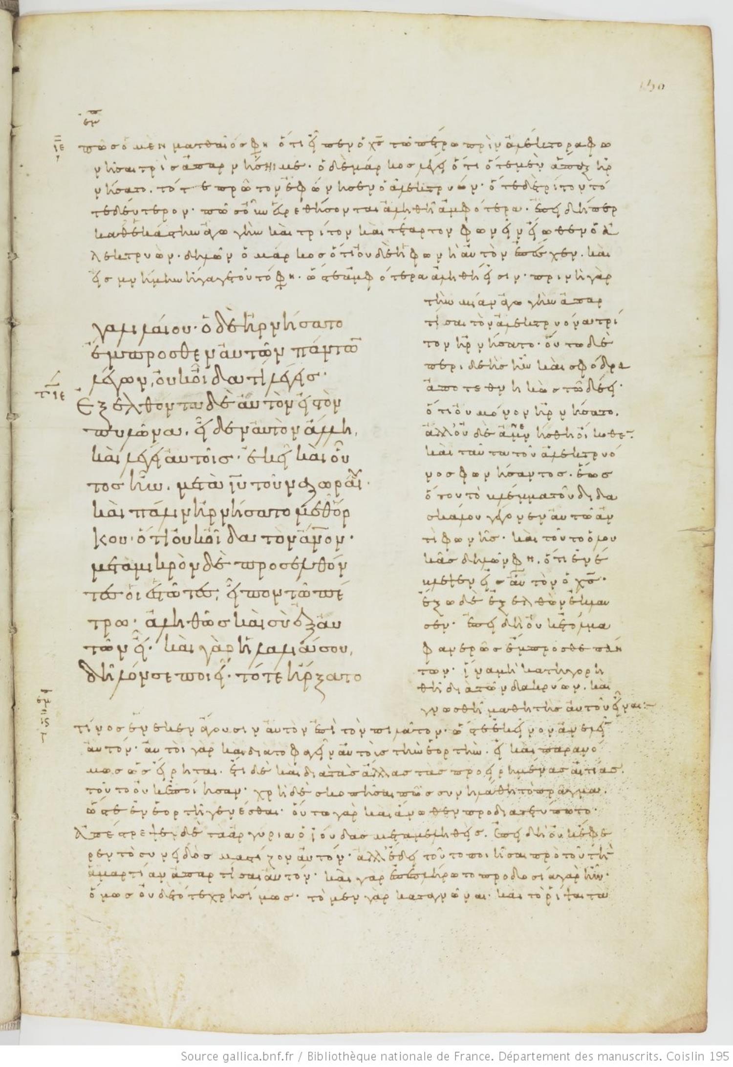 Tenth-century minuscule of the Gospels with commentary on parchment; 469 leaves, 1 column, varying number of lines per column. Images are made available by the Bilbiothèque Nationale. For recent images, please visit BNF Gallica.