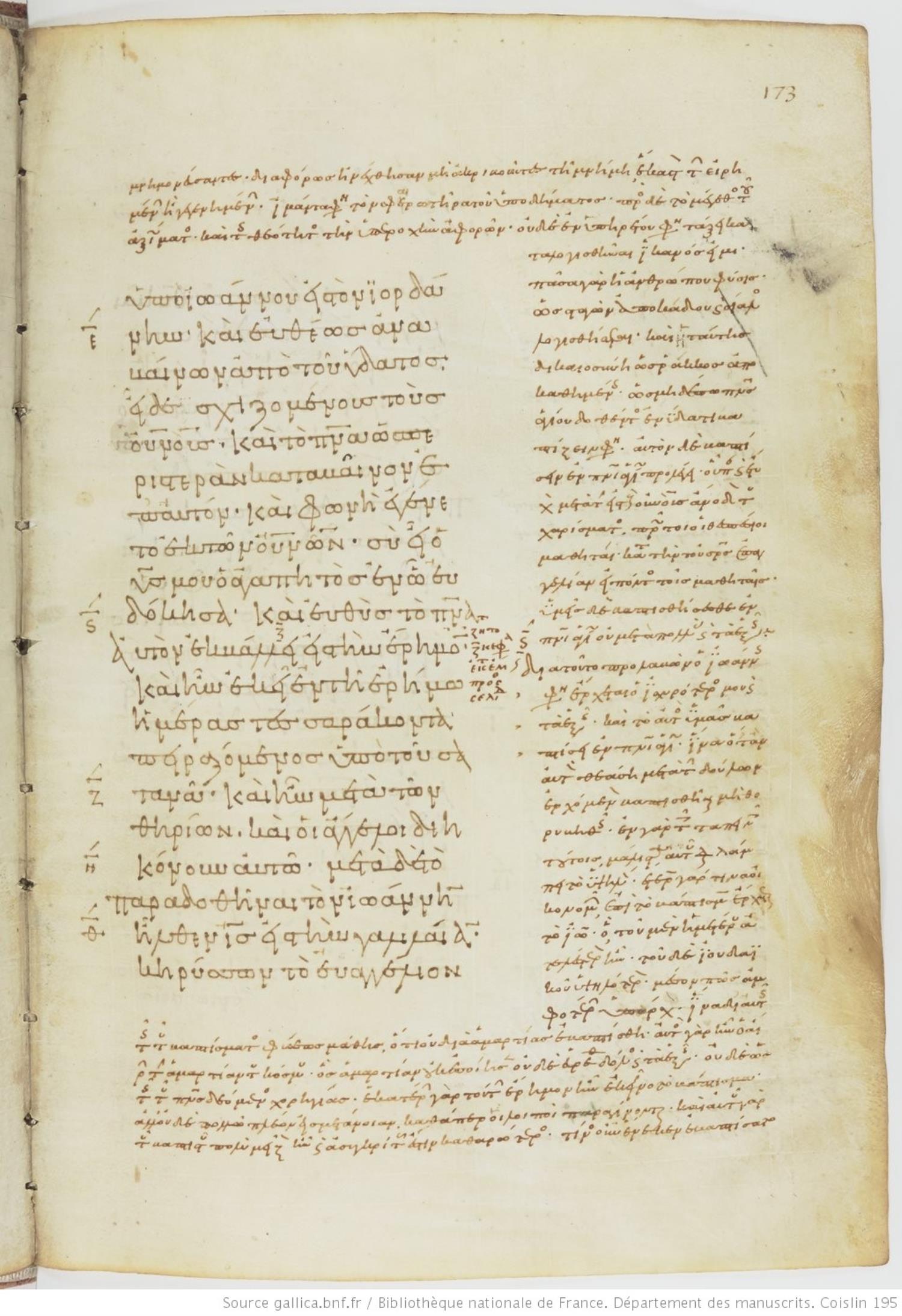 Tenth-century minuscule of the Gospels with commentary on parchment; 469 leaves, 1 column, varying number of lines per column. Images are made available by the Bilbiothèque Nationale. For recent images, please visit BNF Gallica.