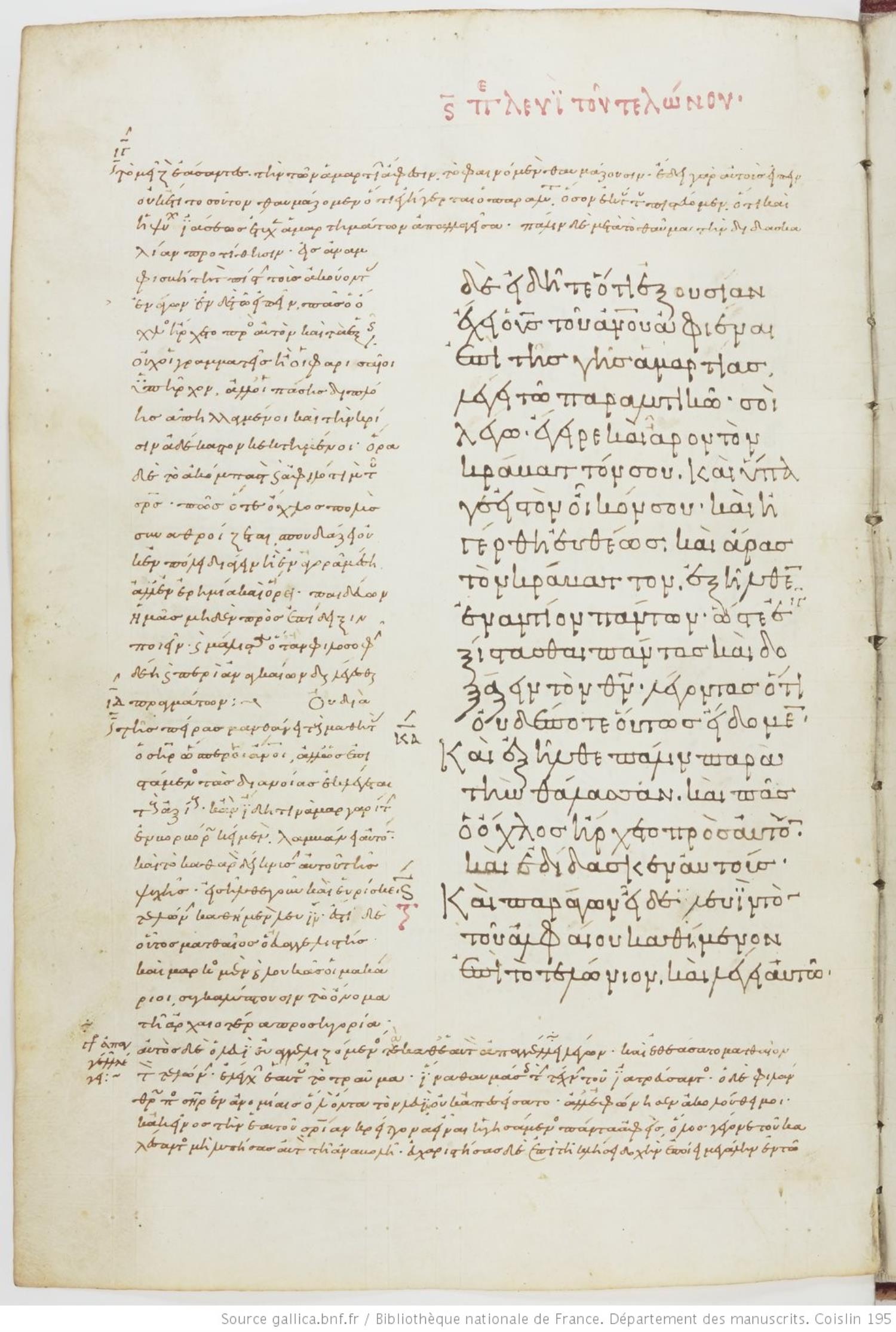 Tenth-century minuscule of the Gospels with commentary on parchment; 469 leaves, 1 column, varying number of lines per column. Images are made available by the Bilbiothèque Nationale. For recent images, please visit BNF Gallica.