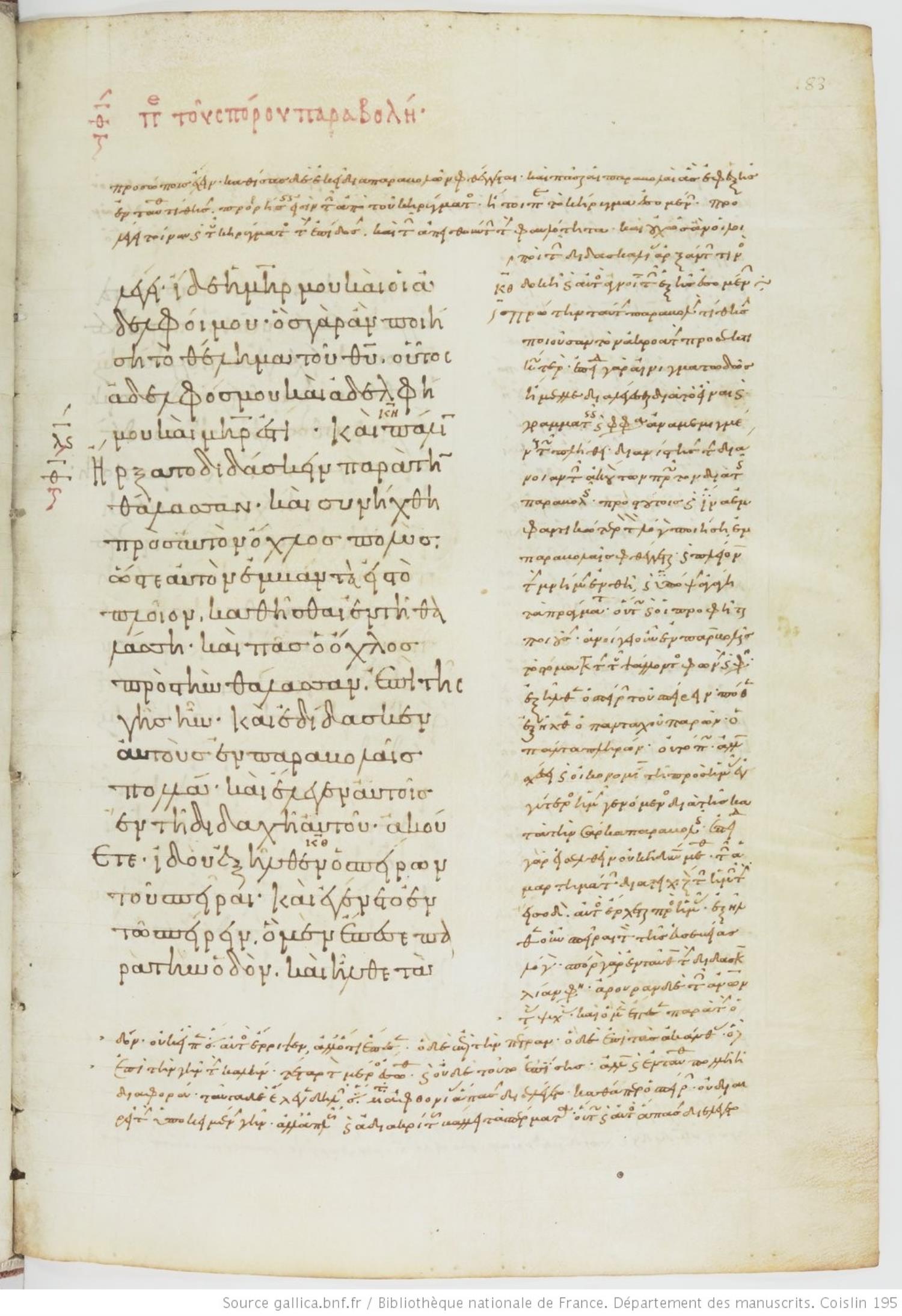Tenth-century minuscule of the Gospels with commentary on parchment; 469 leaves, 1 column, varying number of lines per column. Images are made available by the Bilbiothèque Nationale. For recent images, please visit BNF Gallica.