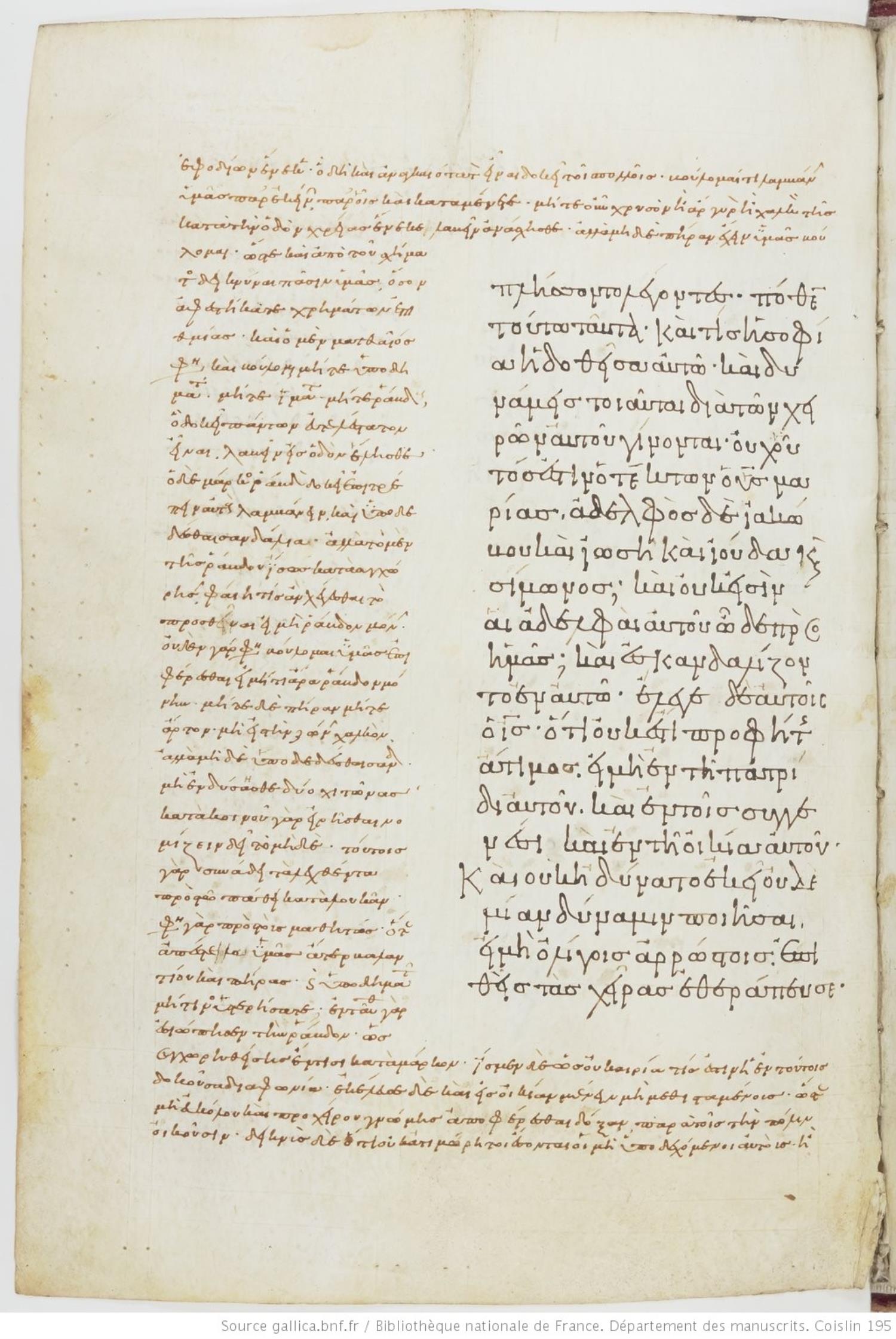 Tenth-century minuscule of the Gospels with commentary on parchment; 469 leaves, 1 column, varying number of lines per column. Images are made available by the Bilbiothèque Nationale. For recent images, please visit BNF Gallica.