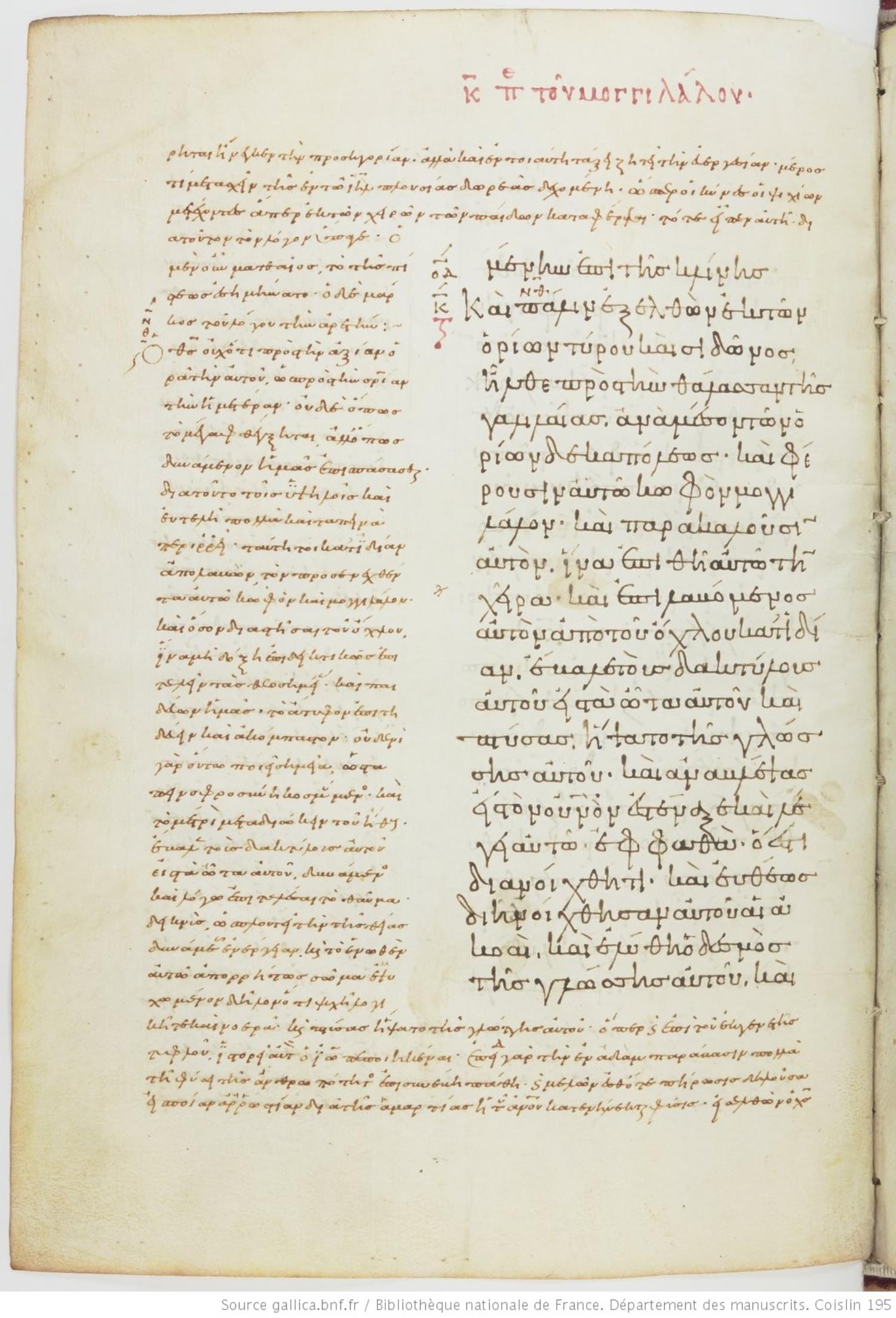 Tenth-century minuscule of the Gospels with commentary on parchment; 469 leaves, 1 column, varying number of lines per column. Images are made available by the Bilbiothèque Nationale. For recent images, please visit BNF Gallica.