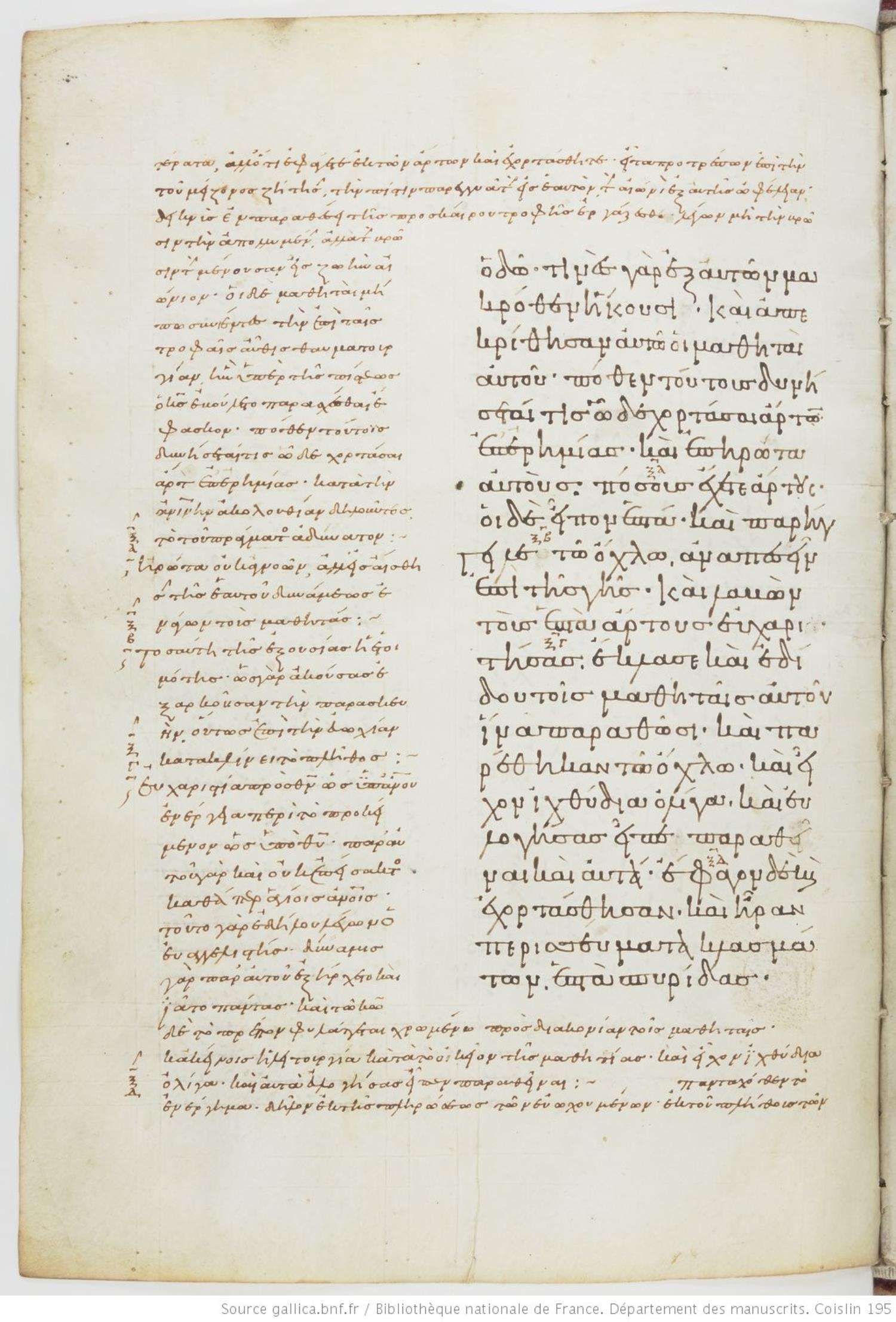 Tenth-century minuscule of the Gospels with commentary on parchment; 469 leaves, 1 column, varying number of lines per column. Images are made available by the Bilbiothèque Nationale. For recent images, please visit BNF Gallica.