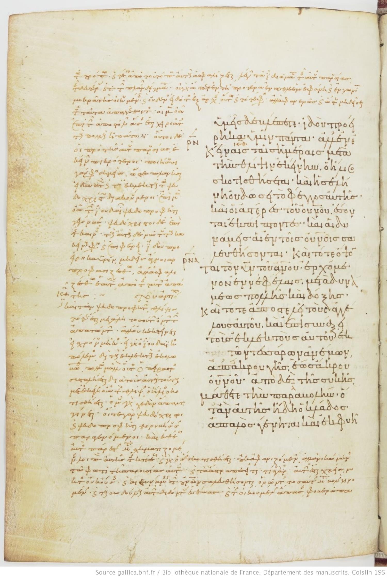 Tenth-century minuscule of the Gospels with commentary on parchment; 469 leaves, 1 column, varying number of lines per column. Images are made available by the Bilbiothèque Nationale. For recent images, please visit BNF Gallica.
