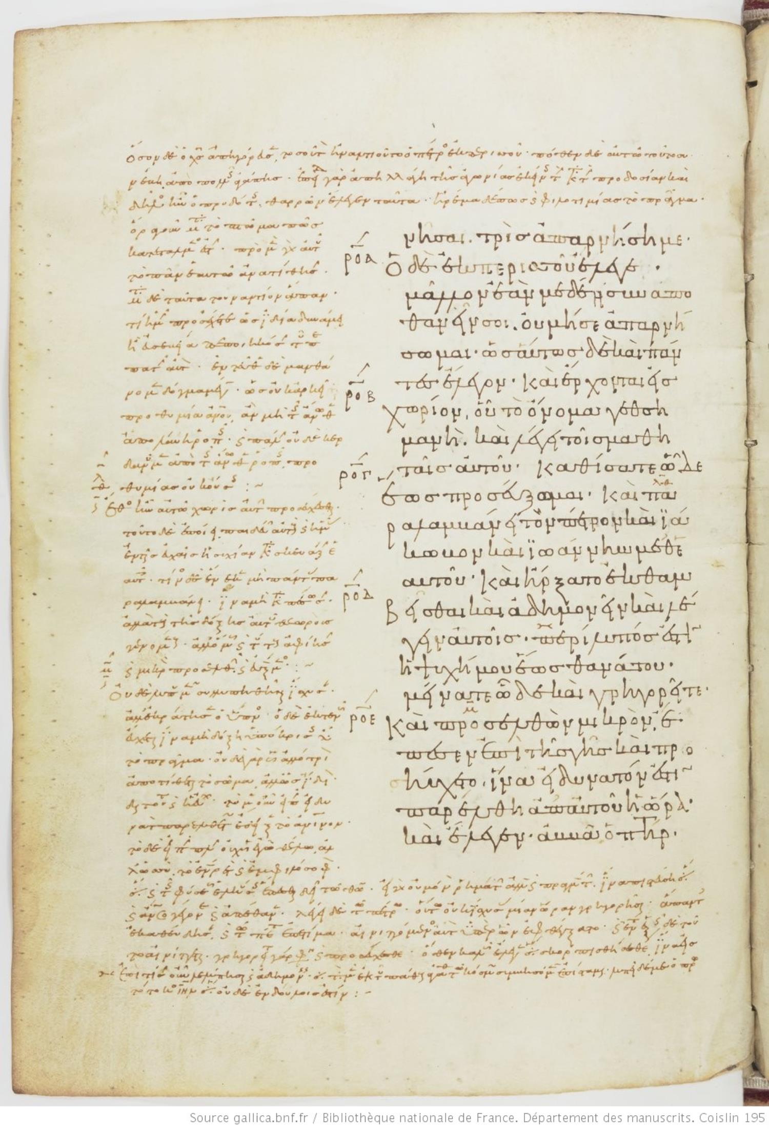 Tenth-century minuscule of the Gospels with commentary on parchment; 469 leaves, 1 column, varying number of lines per column. Images are made available by the Bilbiothèque Nationale. For recent images, please visit BNF Gallica.