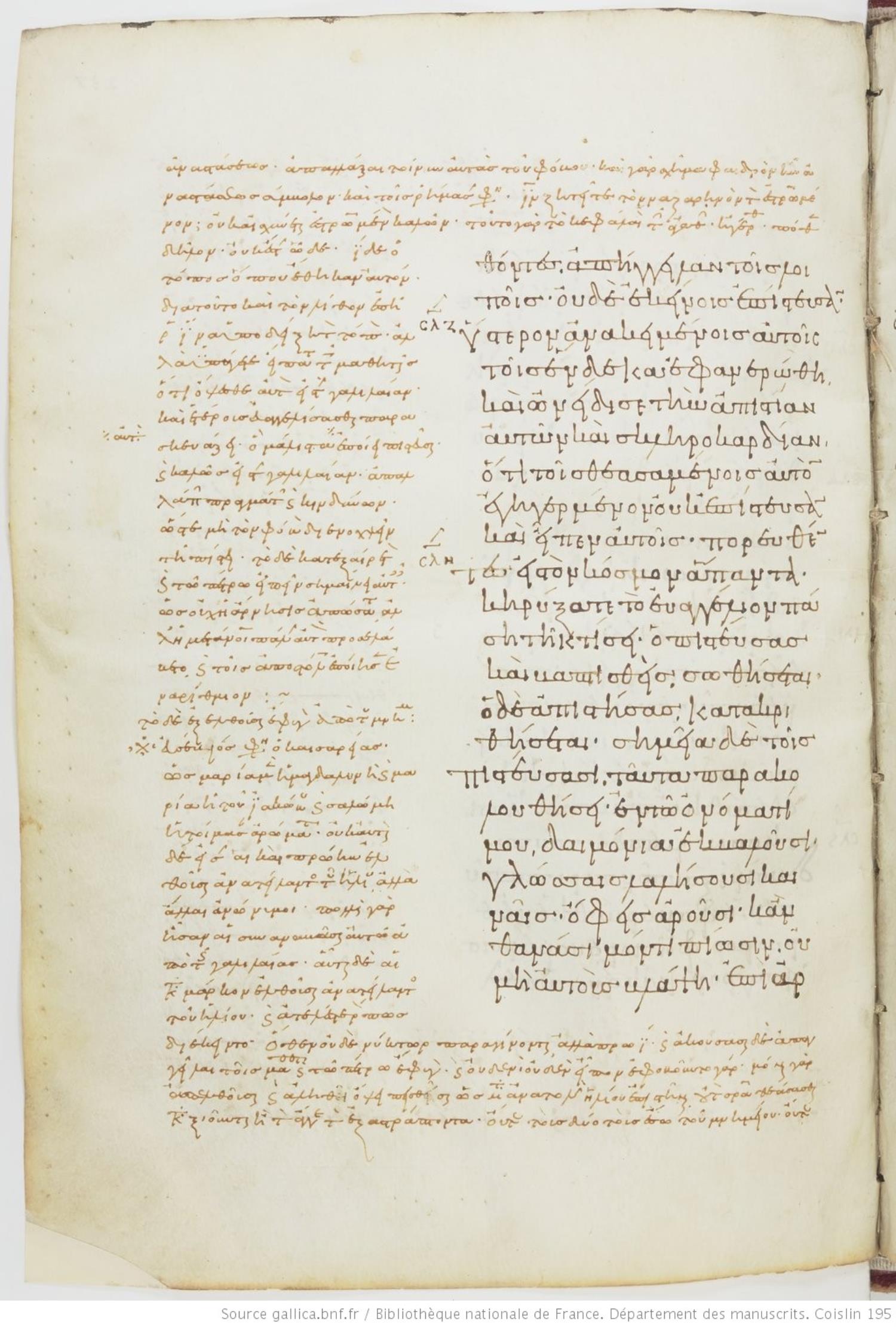 Tenth-century minuscule of the Gospels with commentary on parchment; 469 leaves, 1 column, varying number of lines per column. Images are made available by the Bilbiothèque Nationale. For recent images, please visit BNF Gallica.