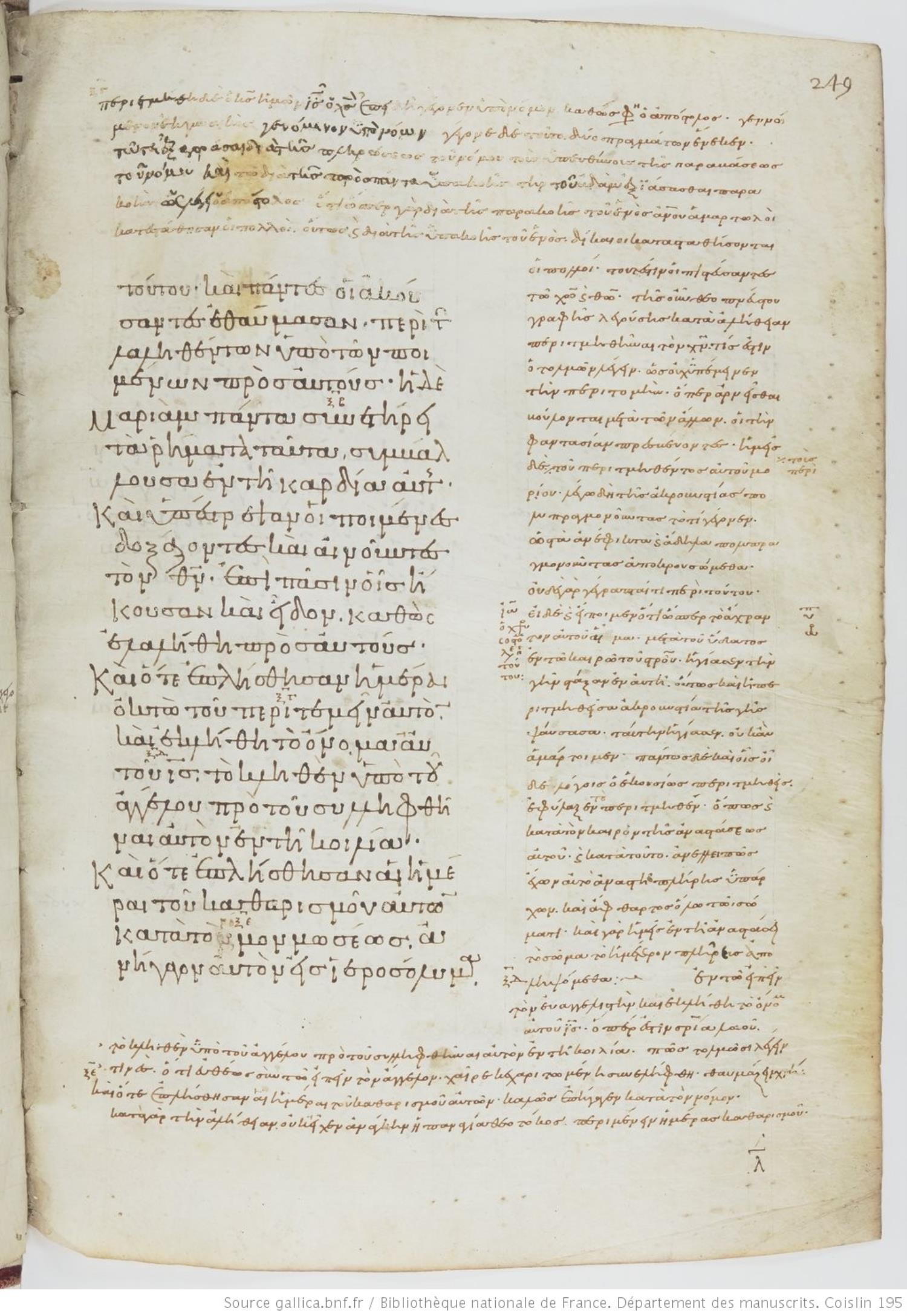Tenth-century minuscule of the Gospels with commentary on parchment; 469 leaves, 1 column, varying number of lines per column. Images are made available by the Bilbiothèque Nationale. For recent images, please visit BNF Gallica.