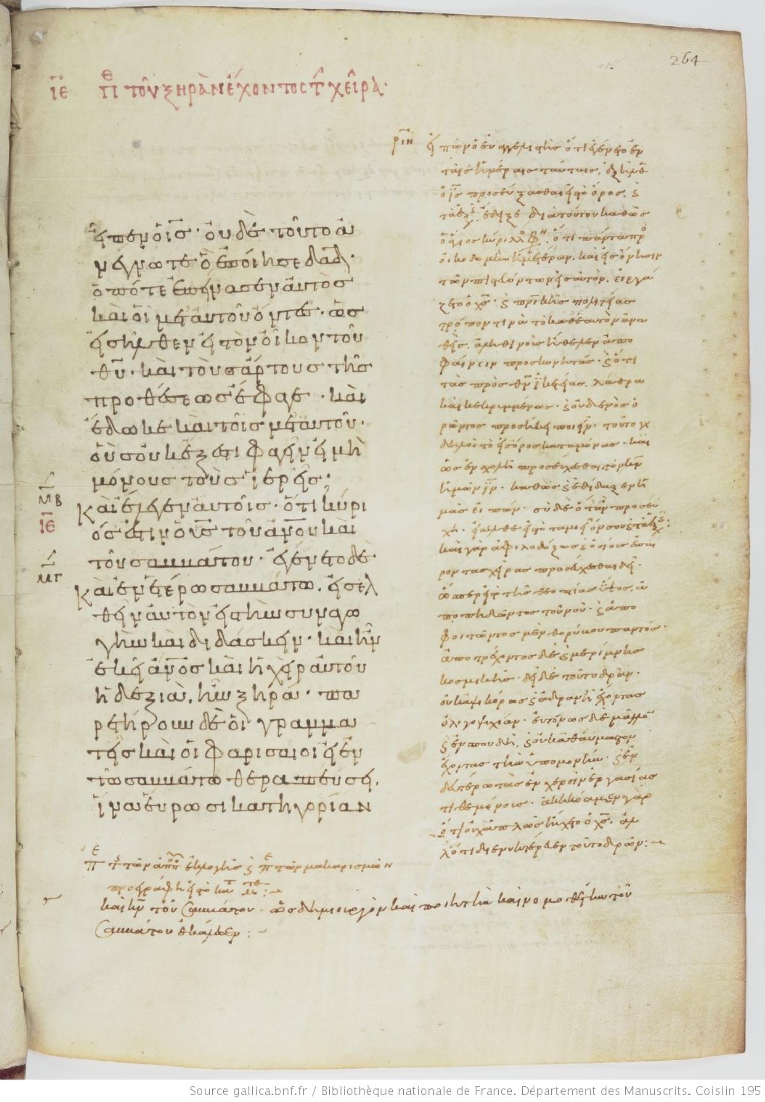 Tenth-century minuscule of the Gospels with commentary on parchment; 469 leaves, 1 column, varying number of lines per column. Images are made available by the Bilbiothèque Nationale. For recent images, please visit BNF Gallica.
