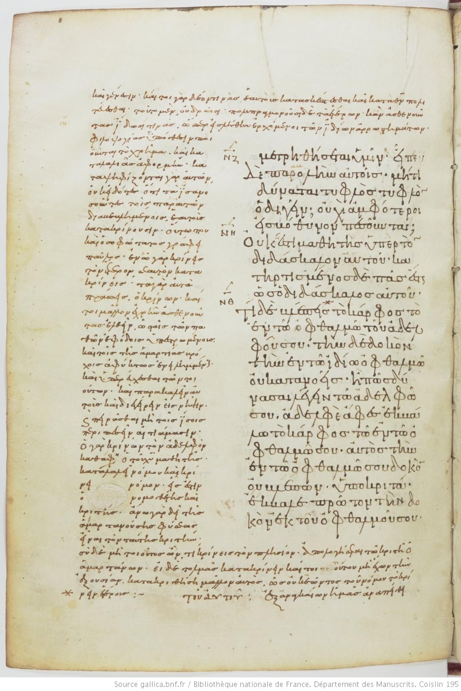 Tenth-century minuscule of the Gospels with commentary on parchment; 469 leaves, 1 column, varying number of lines per column. Images are made available by the Bilbiothèque Nationale. For recent images, please visit BNF Gallica.