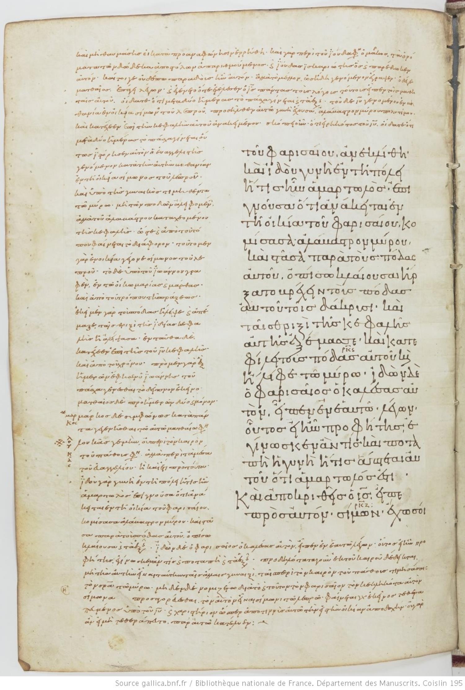Tenth-century minuscule of the Gospels with commentary on parchment; 469 leaves, 1 column, varying number of lines per column. Images are made available by the Bilbiothèque Nationale. For recent images, please visit BNF Gallica.