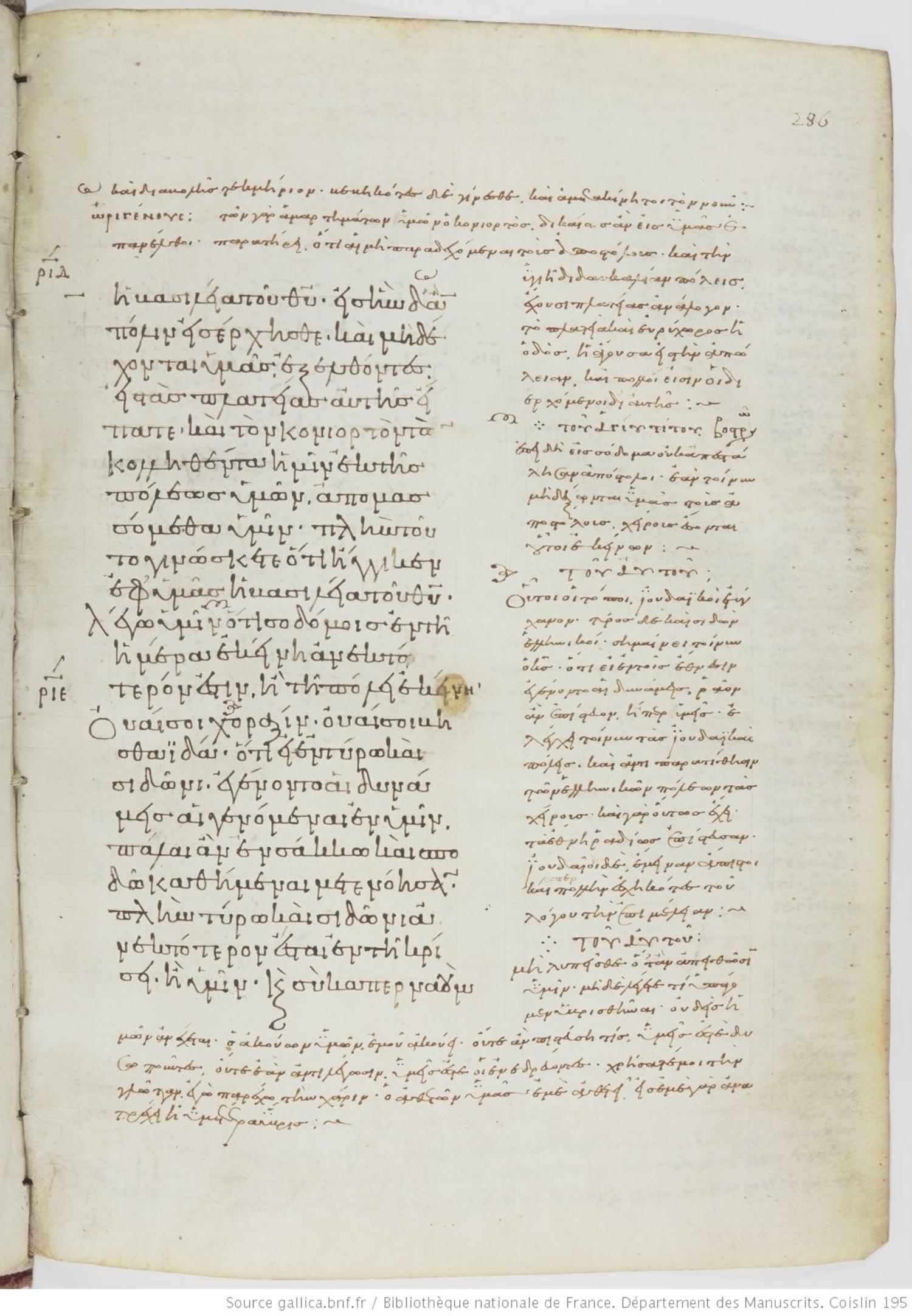 Tenth-century minuscule of the Gospels with commentary on parchment; 469 leaves, 1 column, varying number of lines per column. Images are made available by the Bilbiothèque Nationale. For recent images, please visit BNF Gallica.