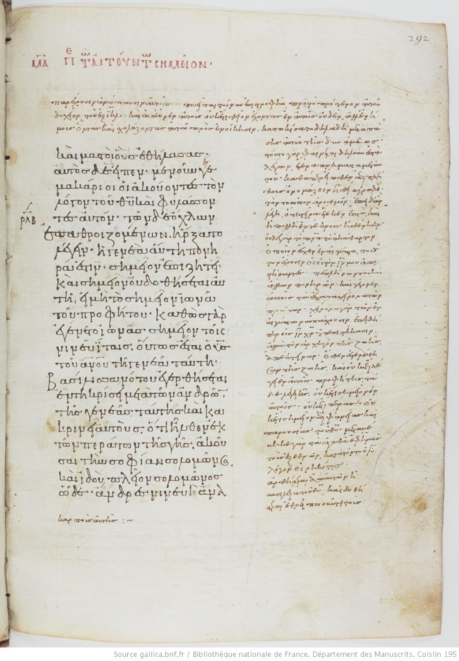 Tenth-century minuscule of the Gospels with commentary on parchment; 469 leaves, 1 column, varying number of lines per column. Images are made available by the Bilbiothèque Nationale. For recent images, please visit BNF Gallica.