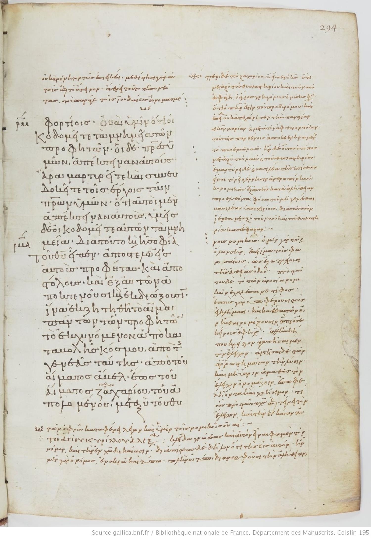 Tenth-century minuscule of the Gospels with commentary on parchment; 469 leaves, 1 column, varying number of lines per column. Images are made available by the Bilbiothèque Nationale. For recent images, please visit BNF Gallica.