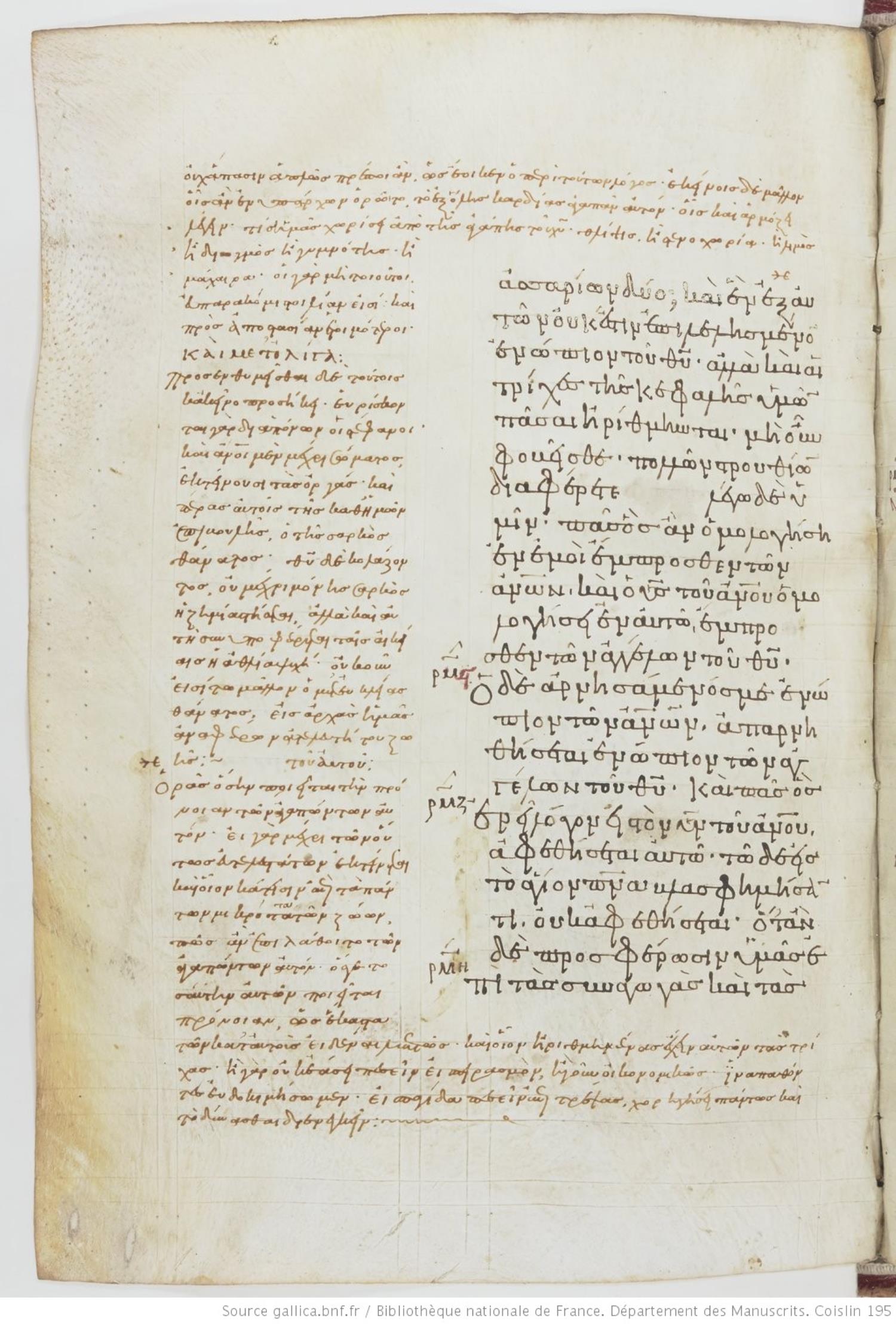 Tenth-century minuscule of the Gospels with commentary on parchment; 469 leaves, 1 column, varying number of lines per column. Images are made available by the Bilbiothèque Nationale. For recent images, please visit BNF Gallica.