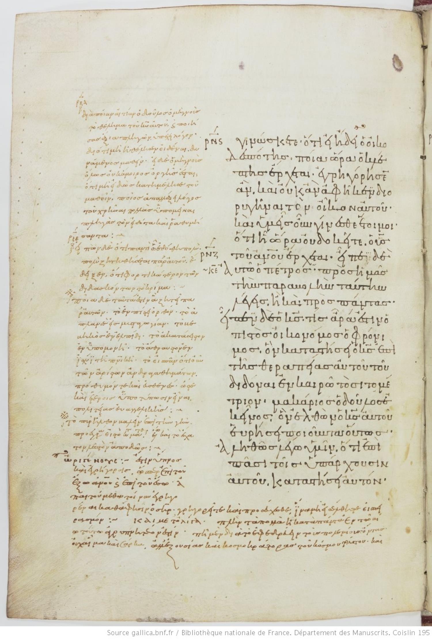 Tenth-century minuscule of the Gospels with commentary on parchment; 469 leaves, 1 column, varying number of lines per column. Images are made available by the Bilbiothèque Nationale. For recent images, please visit BNF Gallica.