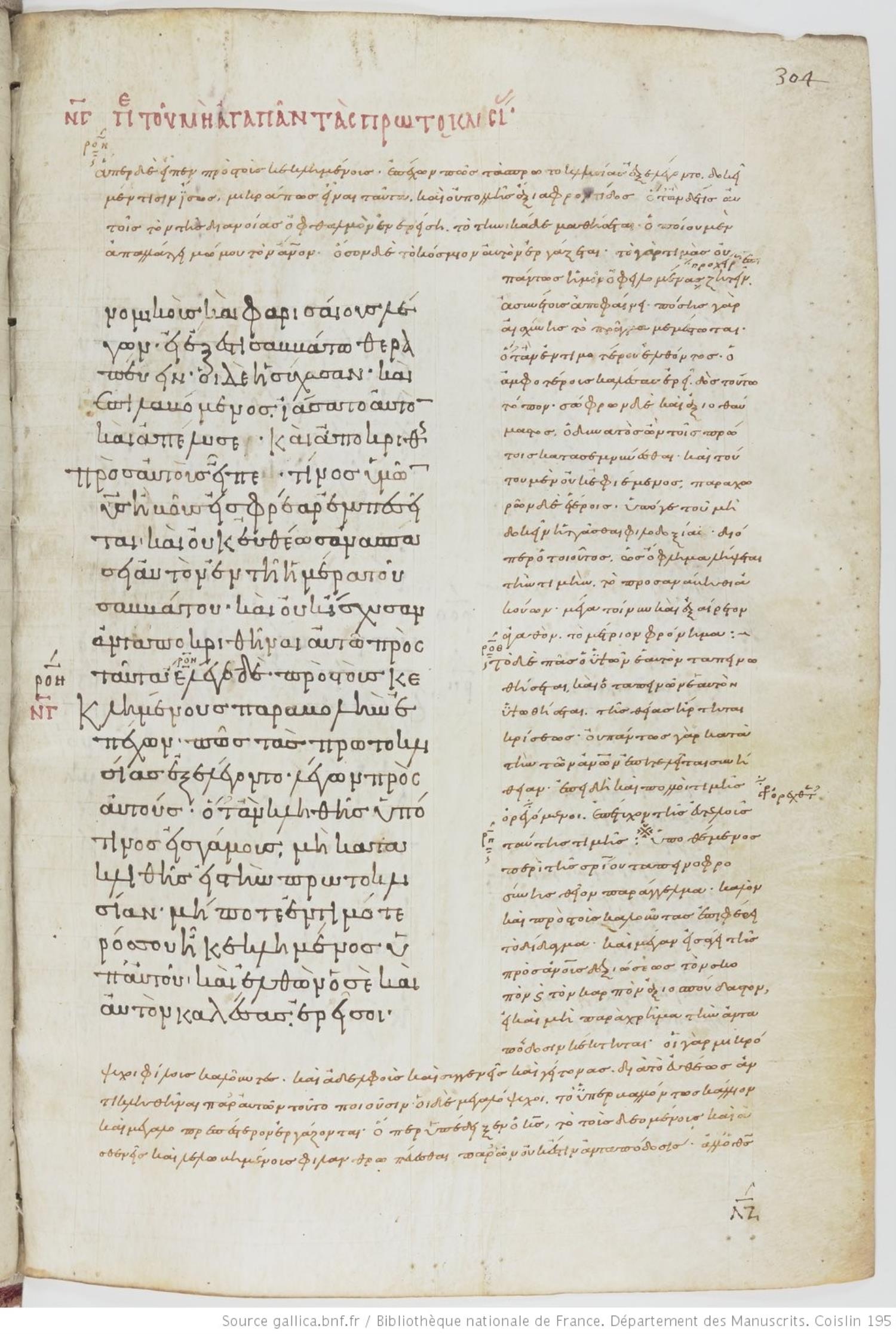 Tenth-century minuscule of the Gospels with commentary on parchment; 469 leaves, 1 column, varying number of lines per column. Images are made available by the Bilbiothèque Nationale. For recent images, please visit BNF Gallica.