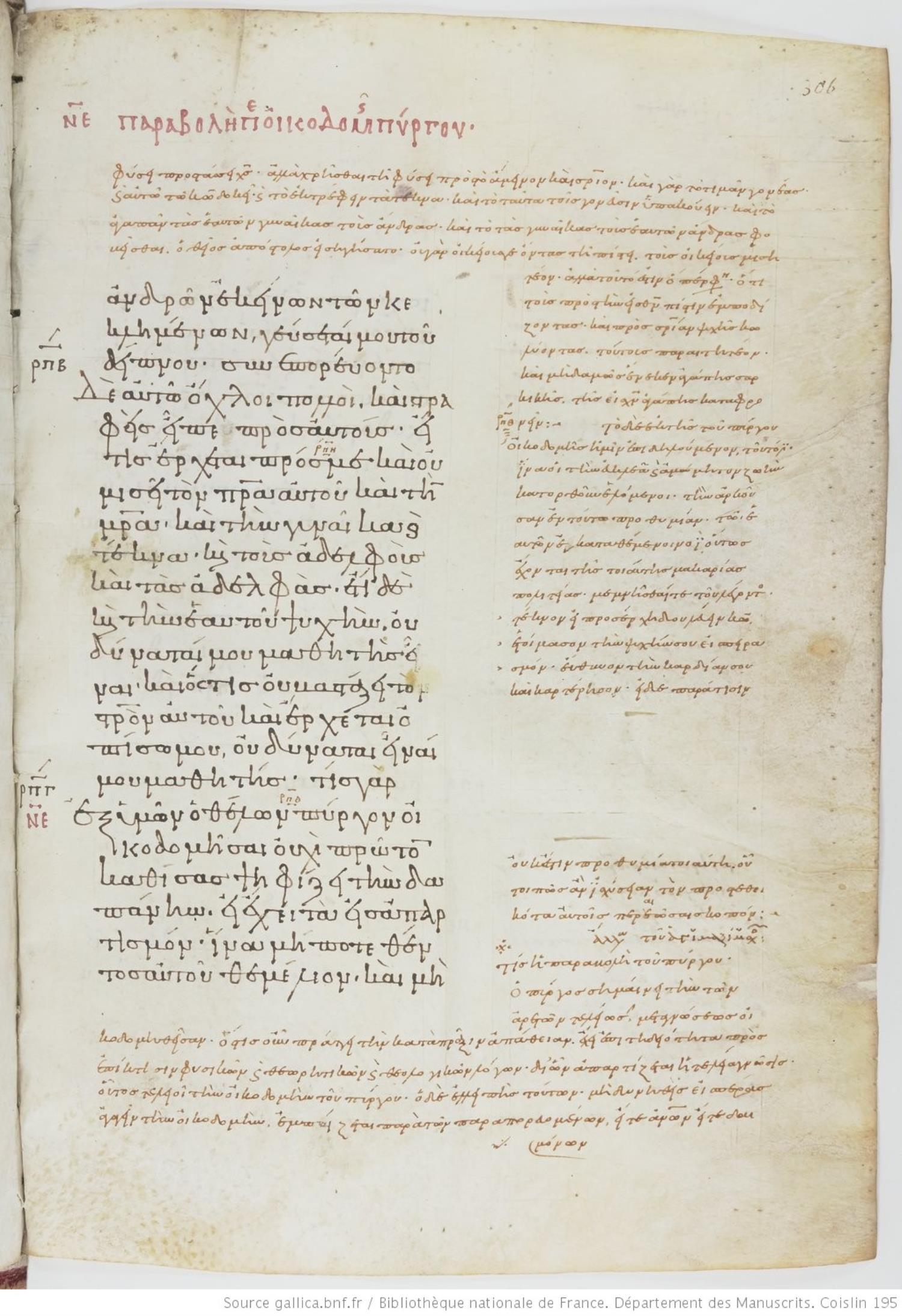 Tenth-century minuscule of the Gospels with commentary on parchment; 469 leaves, 1 column, varying number of lines per column. Images are made available by the Bilbiothèque Nationale. For recent images, please visit BNF Gallica.