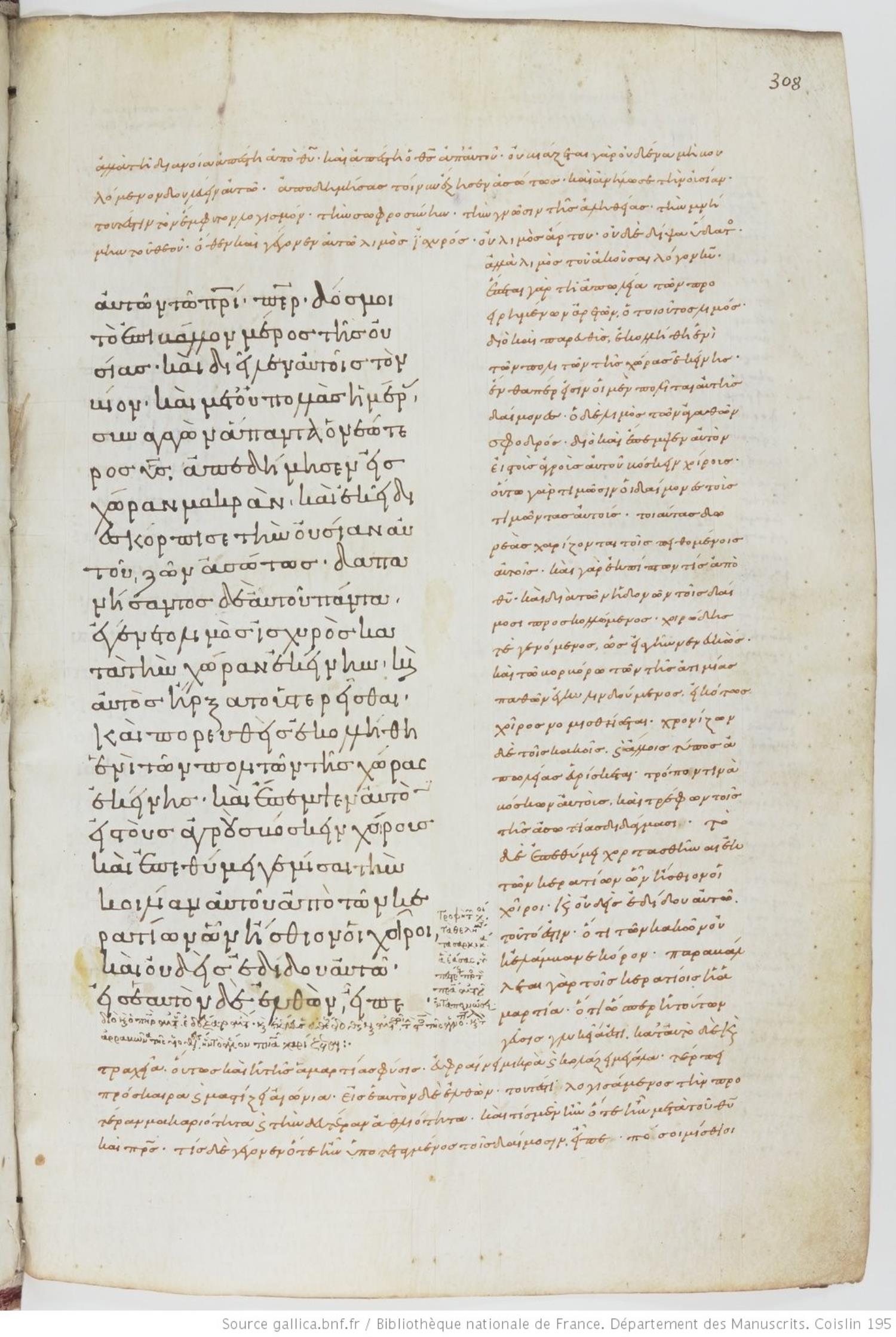 Tenth-century minuscule of the Gospels with commentary on parchment; 469 leaves, 1 column, varying number of lines per column. Images are made available by the Bilbiothèque Nationale. For recent images, please visit BNF Gallica.