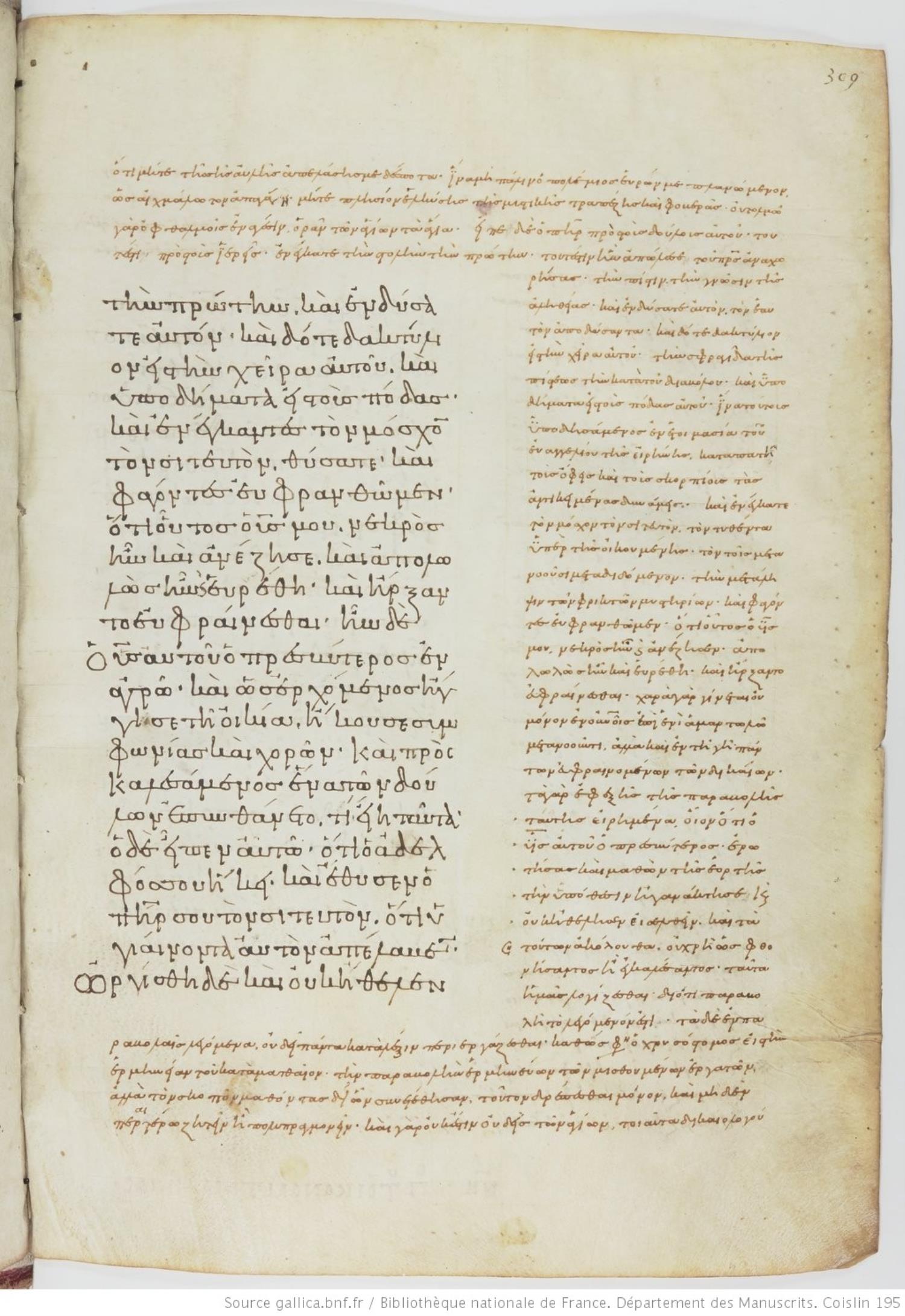 Tenth-century minuscule of the Gospels with commentary on parchment; 469 leaves, 1 column, varying number of lines per column. Images are made available by the Bilbiothèque Nationale. For recent images, please visit BNF Gallica.