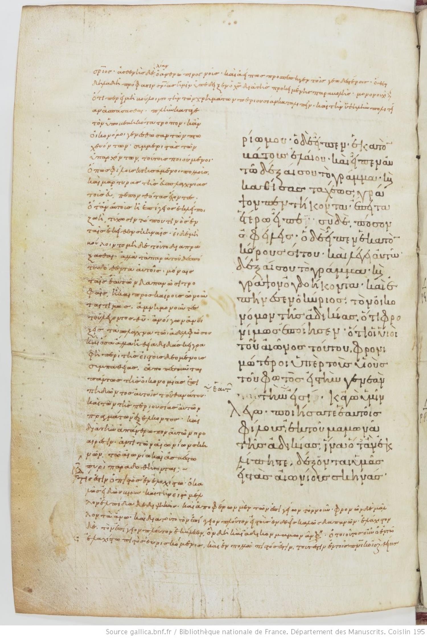 Tenth-century minuscule of the Gospels with commentary on parchment; 469 leaves, 1 column, varying number of lines per column. Images are made available by the Bilbiothèque Nationale. For recent images, please visit BNF Gallica.