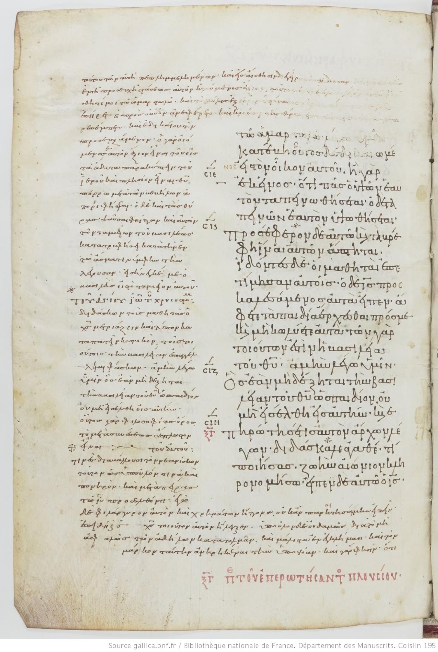 Tenth-century minuscule of the Gospels with commentary on parchment; 469 leaves, 1 column, varying number of lines per column. Images are made available by the Bilbiothèque Nationale. For recent images, please visit BNF Gallica.