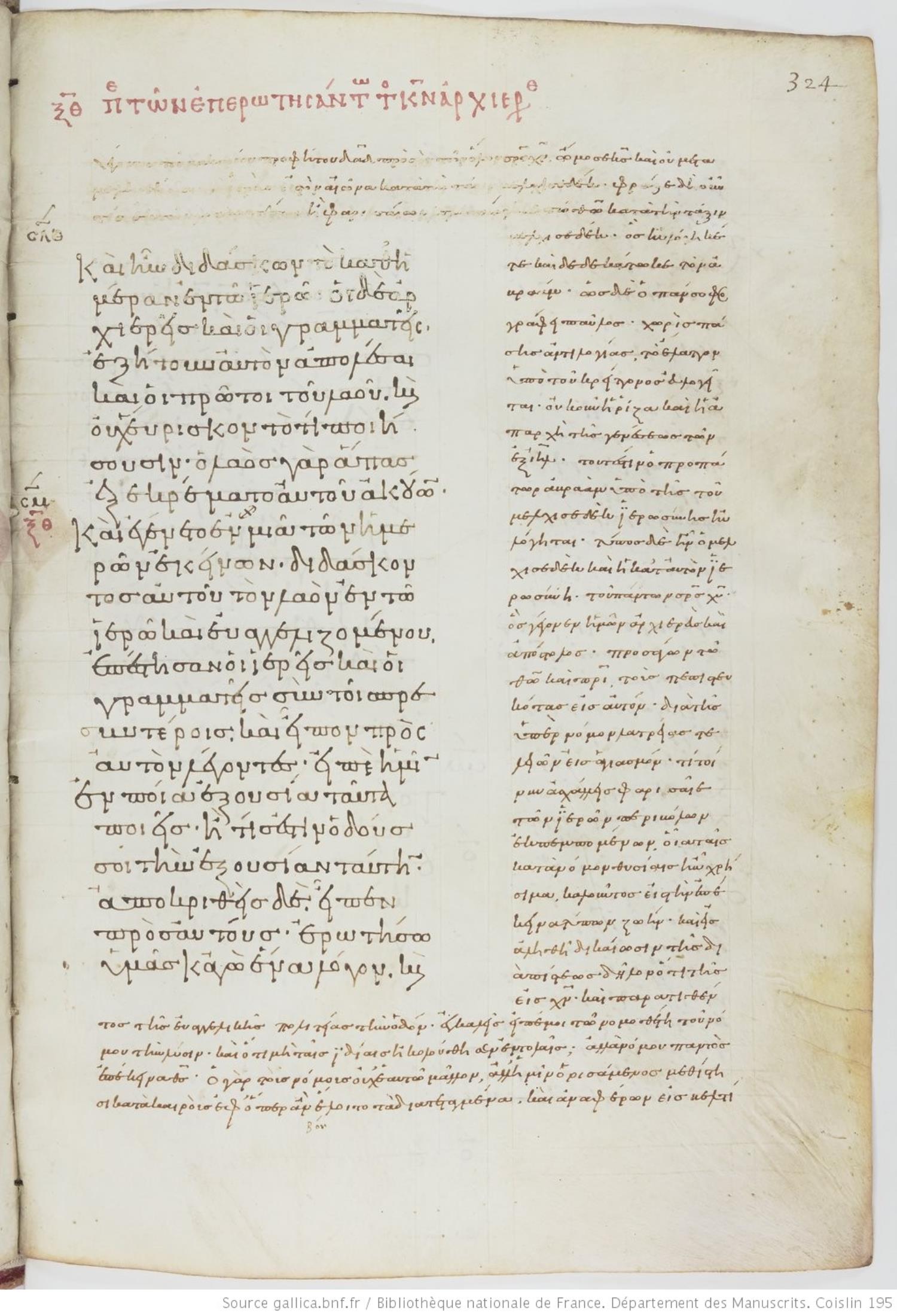 Tenth-century minuscule of the Gospels with commentary on parchment; 469 leaves, 1 column, varying number of lines per column. Images are made available by the Bilbiothèque Nationale. For recent images, please visit BNF Gallica.