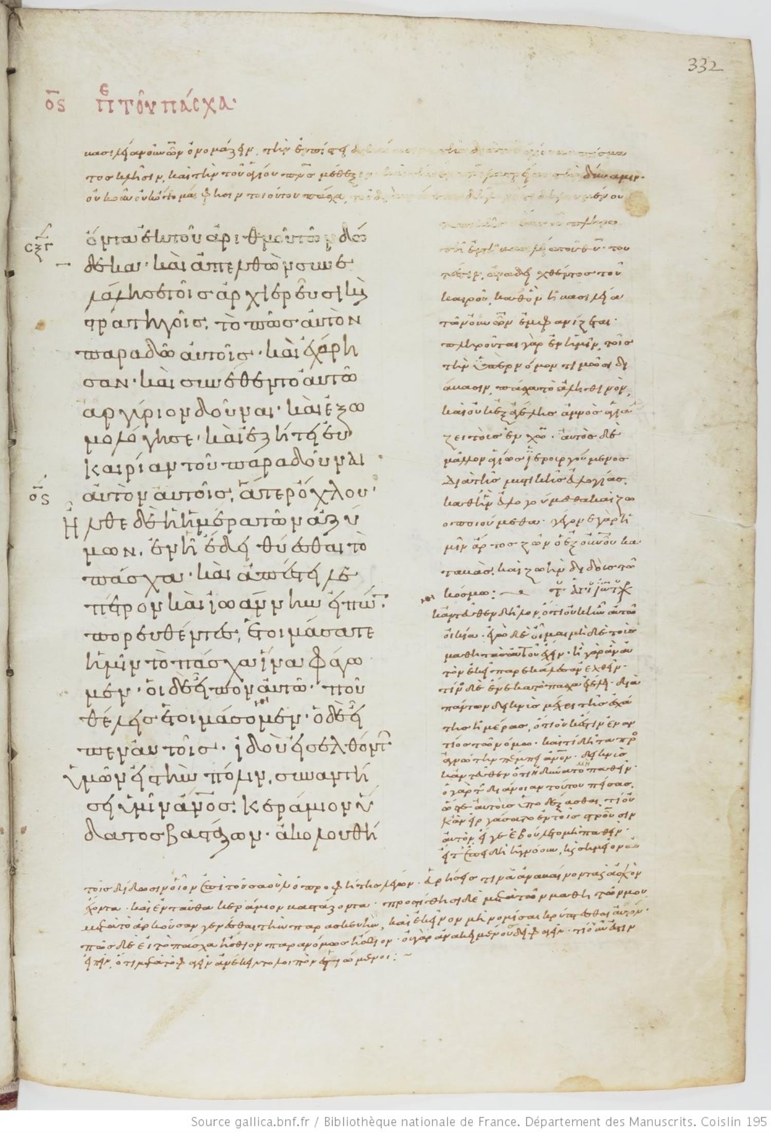 Tenth-century minuscule of the Gospels with commentary on parchment; 469 leaves, 1 column, varying number of lines per column. Images are made available by the Bilbiothèque Nationale. For recent images, please visit BNF Gallica.