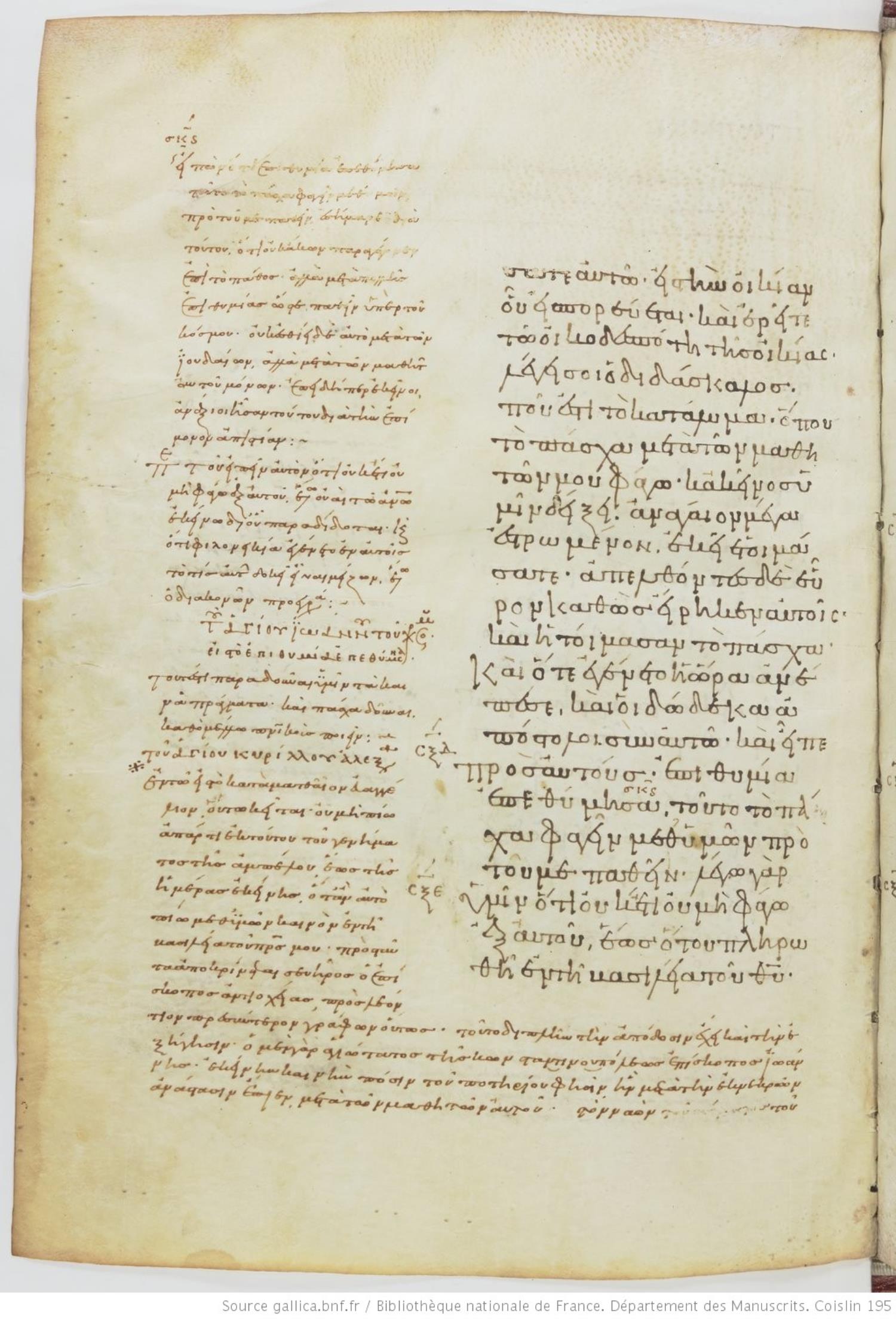 Tenth-century minuscule of the Gospels with commentary on parchment; 469 leaves, 1 column, varying number of lines per column. Images are made available by the Bilbiothèque Nationale. For recent images, please visit BNF Gallica.