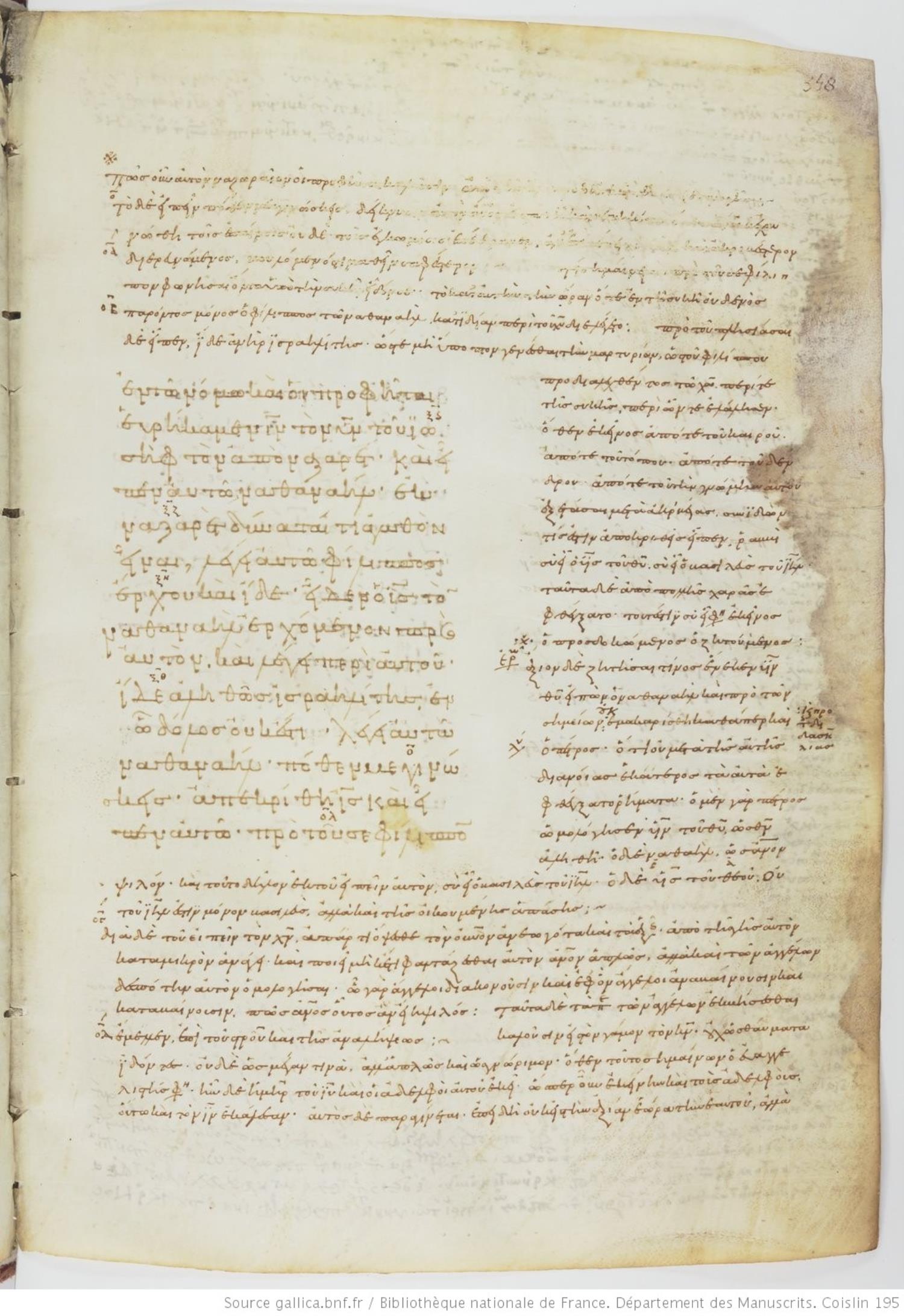 Tenth-century minuscule of the Gospels with commentary on parchment; 469 leaves, 1 column, varying number of lines per column. Images are made available by the Bilbiothèque Nationale. For recent images, please visit BNF Gallica.