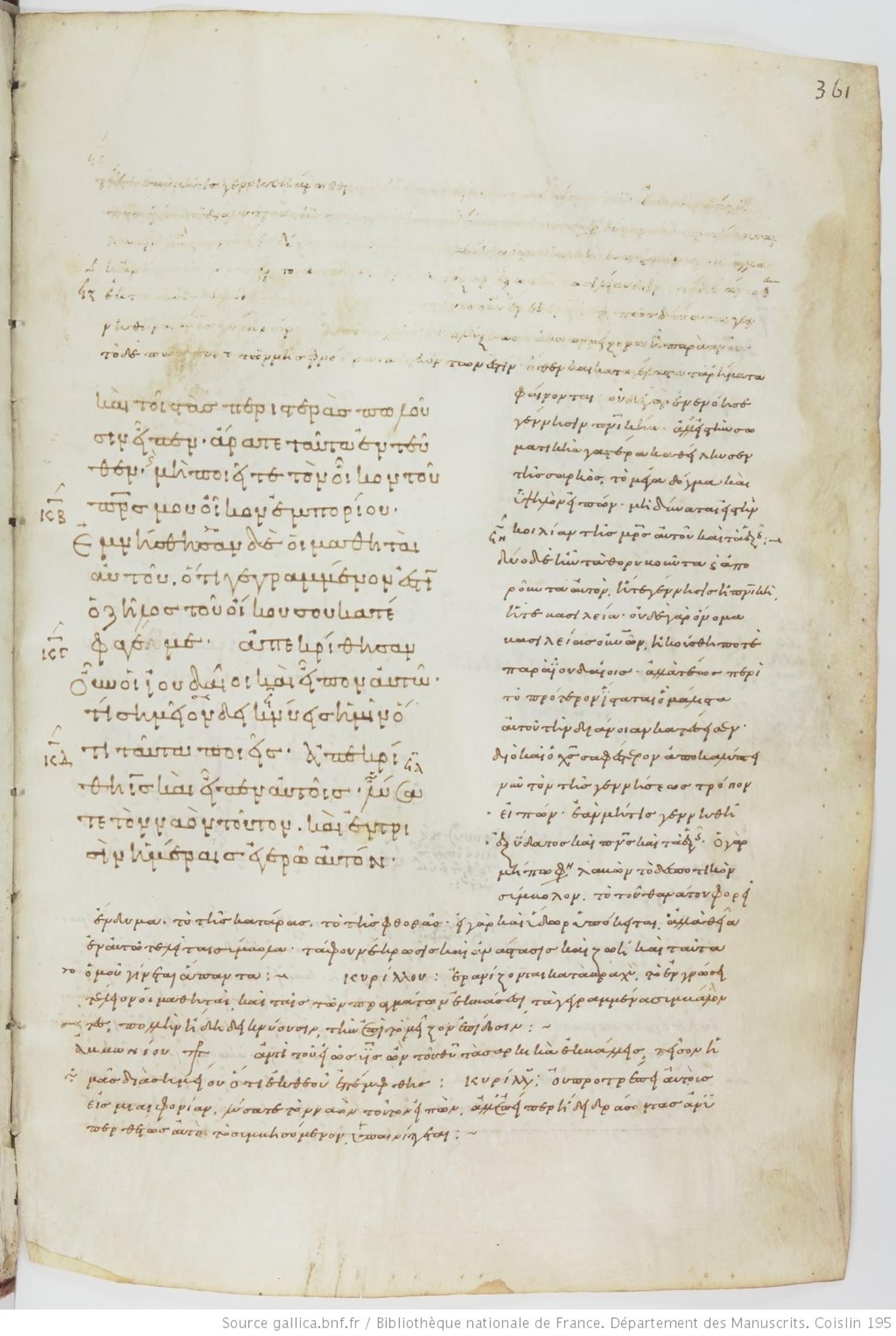 Tenth-century minuscule of the Gospels with commentary on parchment; 469 leaves, 1 column, varying number of lines per column. Images are made available by the Bilbiothèque Nationale. For recent images, please visit BNF Gallica.