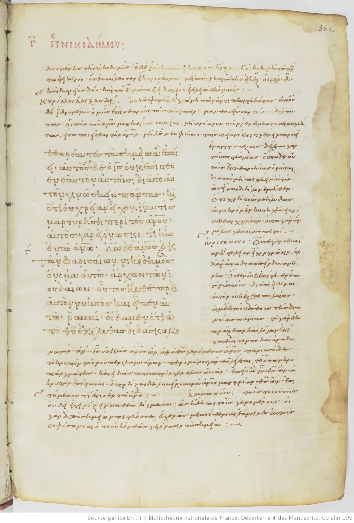 Tenth-century minuscule of the Gospels with commentary on parchment; 469 leaves, 1 column, varying number of lines per column. Images are made available by the Bilbiothèque Nationale. For recent images, please visit BNF Gallica.