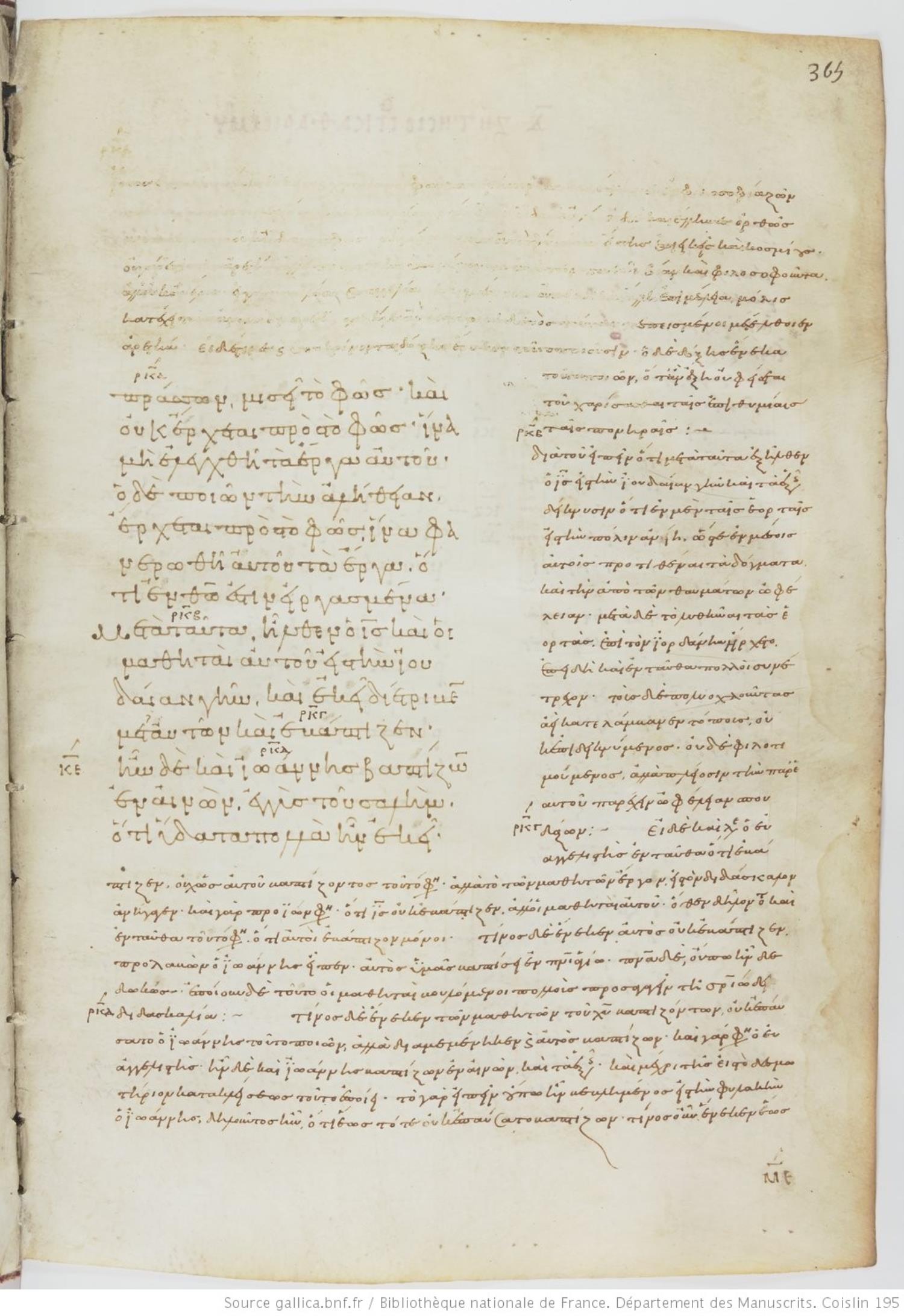 Tenth-century minuscule of the Gospels with commentary on parchment; 469 leaves, 1 column, varying number of lines per column. Images are made available by the Bilbiothèque Nationale. For recent images, please visit BNF Gallica.