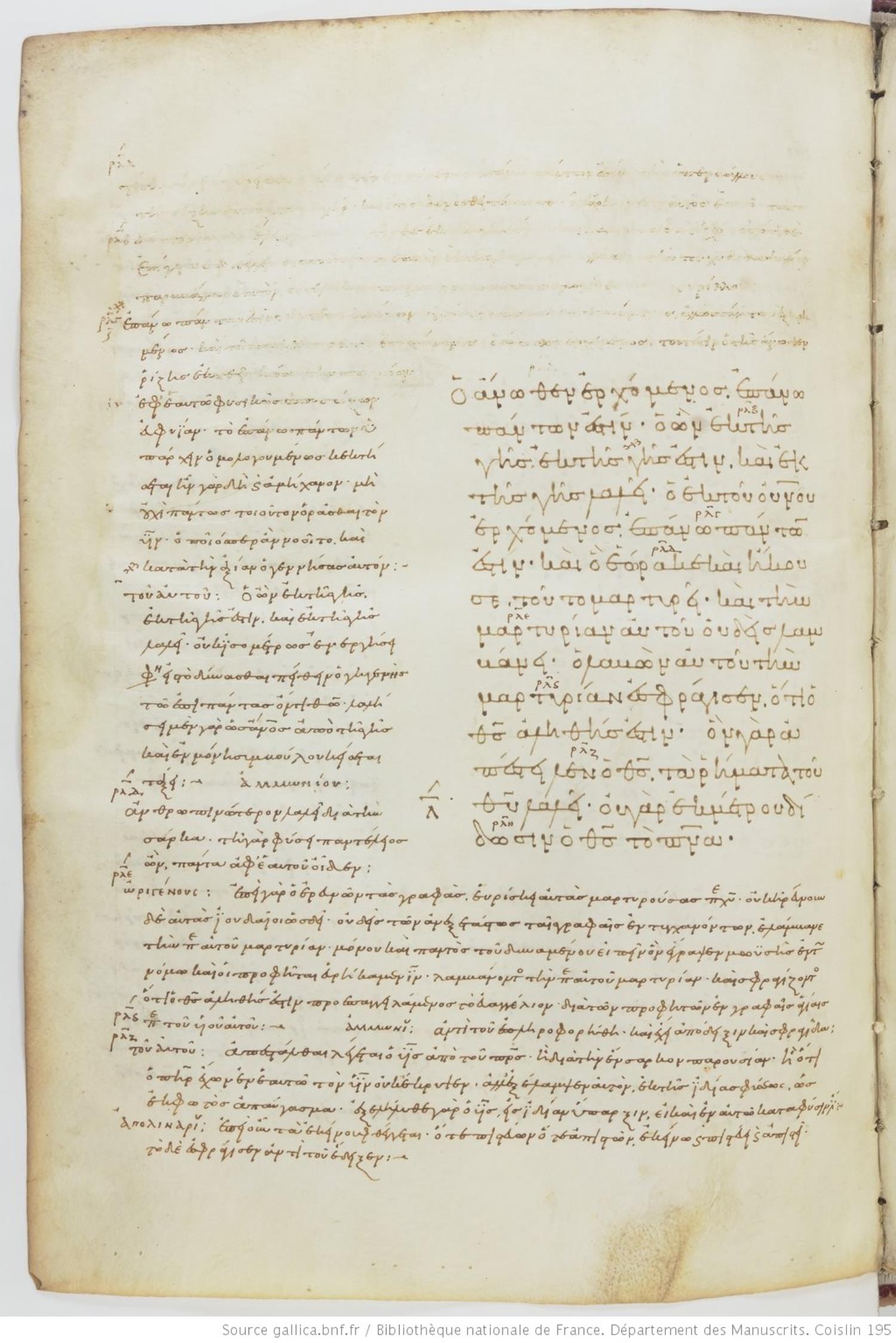 Tenth-century minuscule of the Gospels with commentary on parchment; 469 leaves, 1 column, varying number of lines per column. Images are made available by the Bilbiothèque Nationale. For recent images, please visit BNF Gallica.