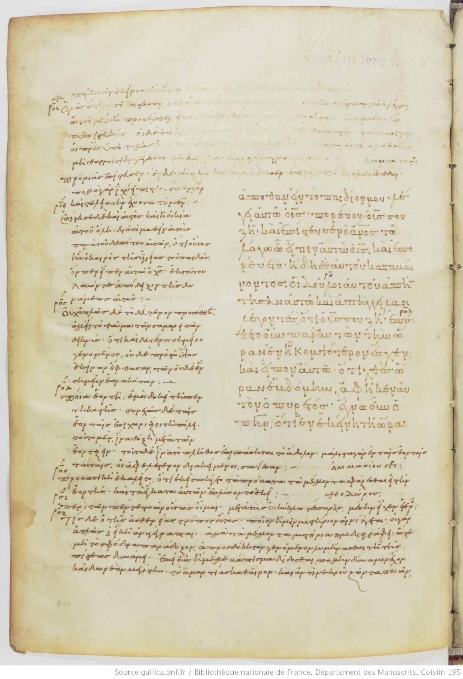 Tenth-century minuscule of the Gospels with commentary on parchment; 469 leaves, 1 column, varying number of lines per column. Images are made available by the Bilbiothèque Nationale. For recent images, please visit BNF Gallica.
