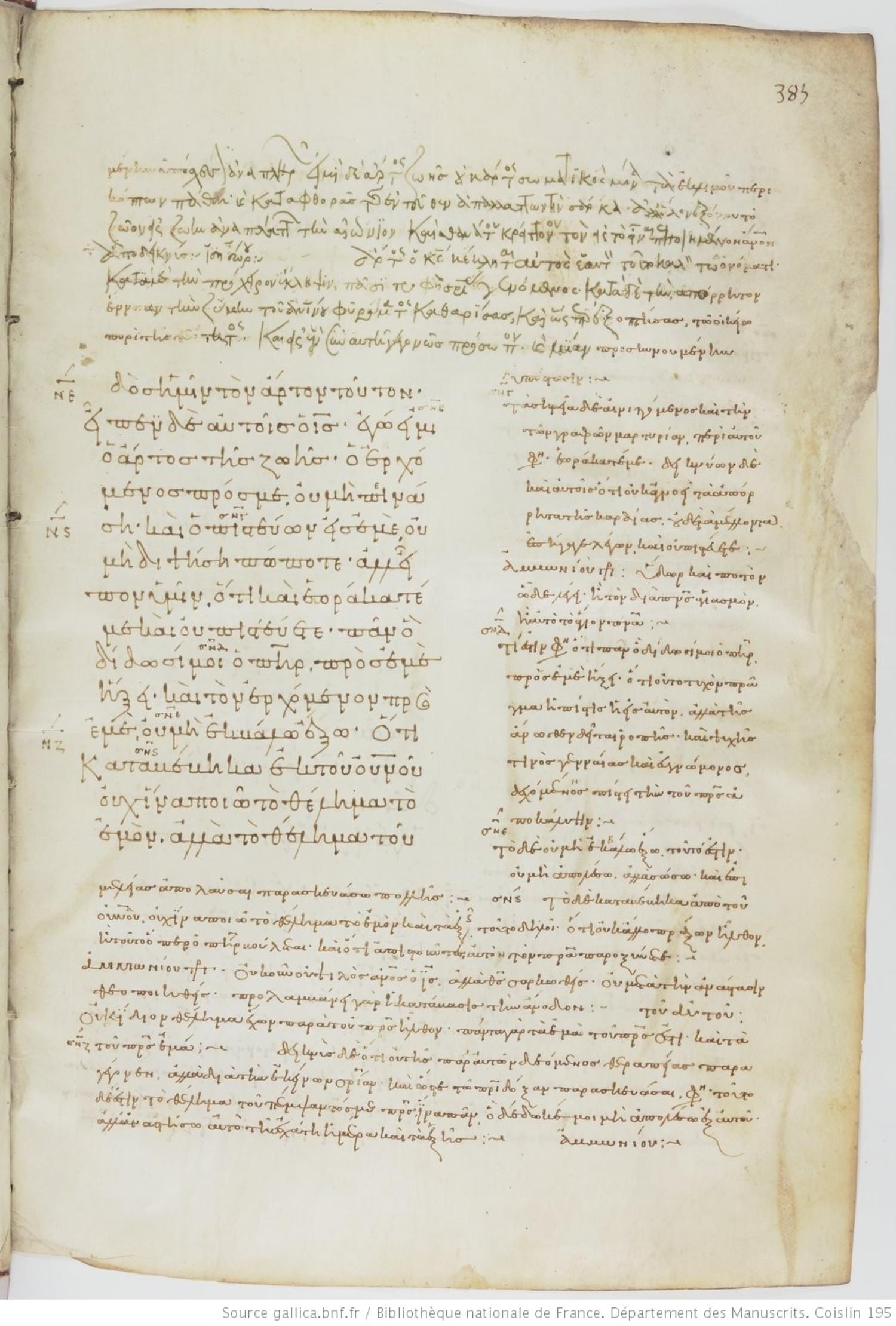Tenth-century minuscule of the Gospels with commentary on parchment; 469 leaves, 1 column, varying number of lines per column. Images are made available by the Bilbiothèque Nationale. For recent images, please visit BNF Gallica.