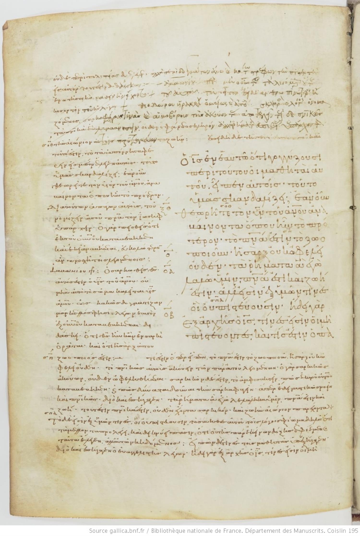 Tenth-century minuscule of the Gospels with commentary on parchment; 469 leaves, 1 column, varying number of lines per column. Images are made available by the Bilbiothèque Nationale. For recent images, please visit BNF Gallica.