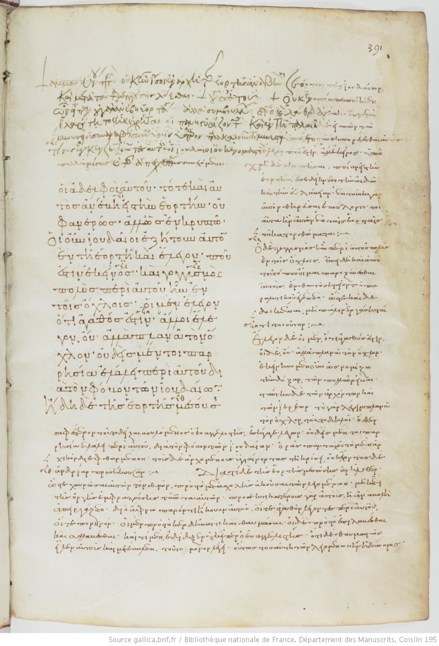 Tenth-century minuscule of the Gospels with commentary on parchment; 469 leaves, 1 column, varying number of lines per column. Images are made available by the Bilbiothèque Nationale. For recent images, please visit BNF Gallica.
