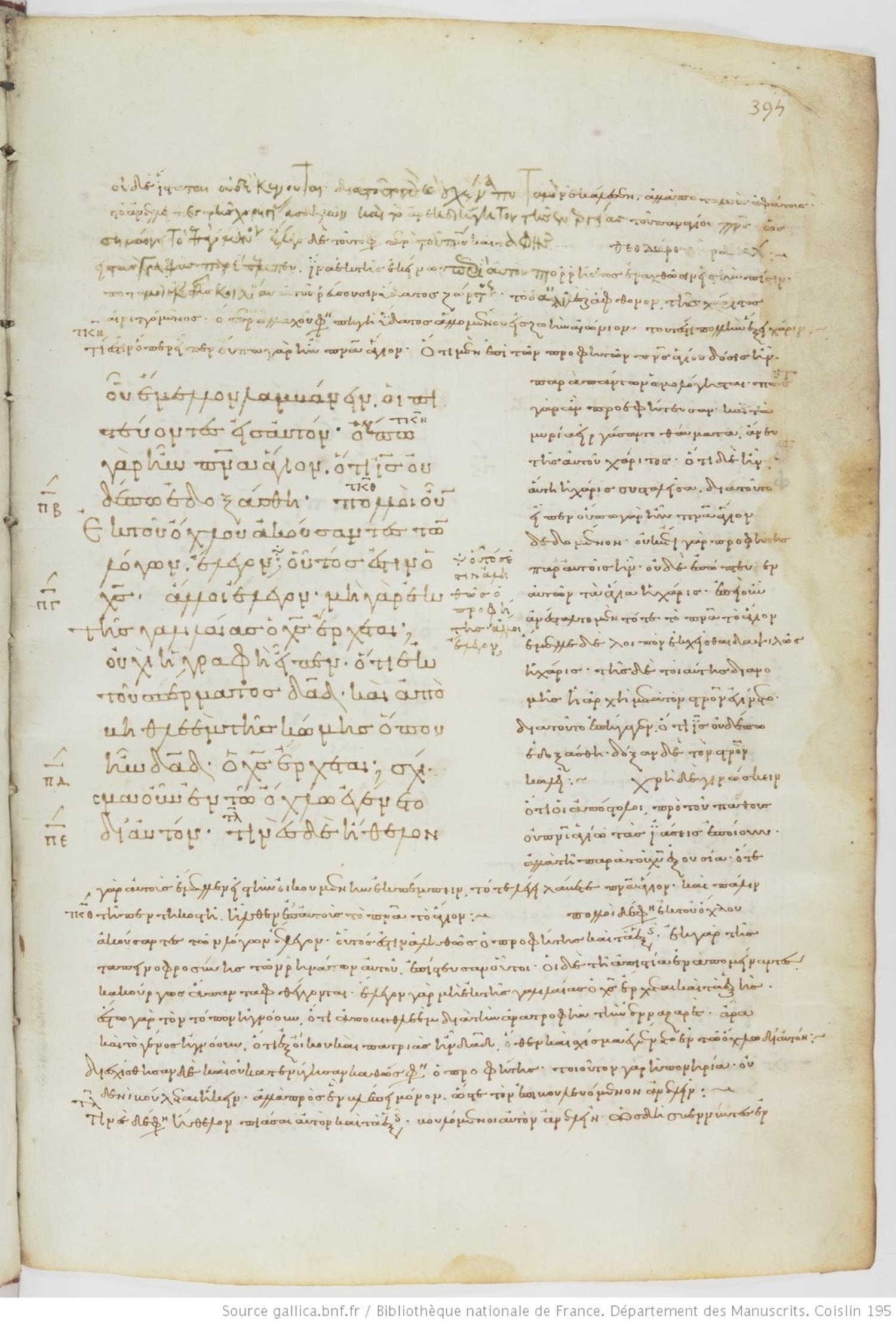 Tenth-century minuscule of the Gospels with commentary on parchment; 469 leaves, 1 column, varying number of lines per column. Images are made available by the Bilbiothèque Nationale. For recent images, please visit BNF Gallica.