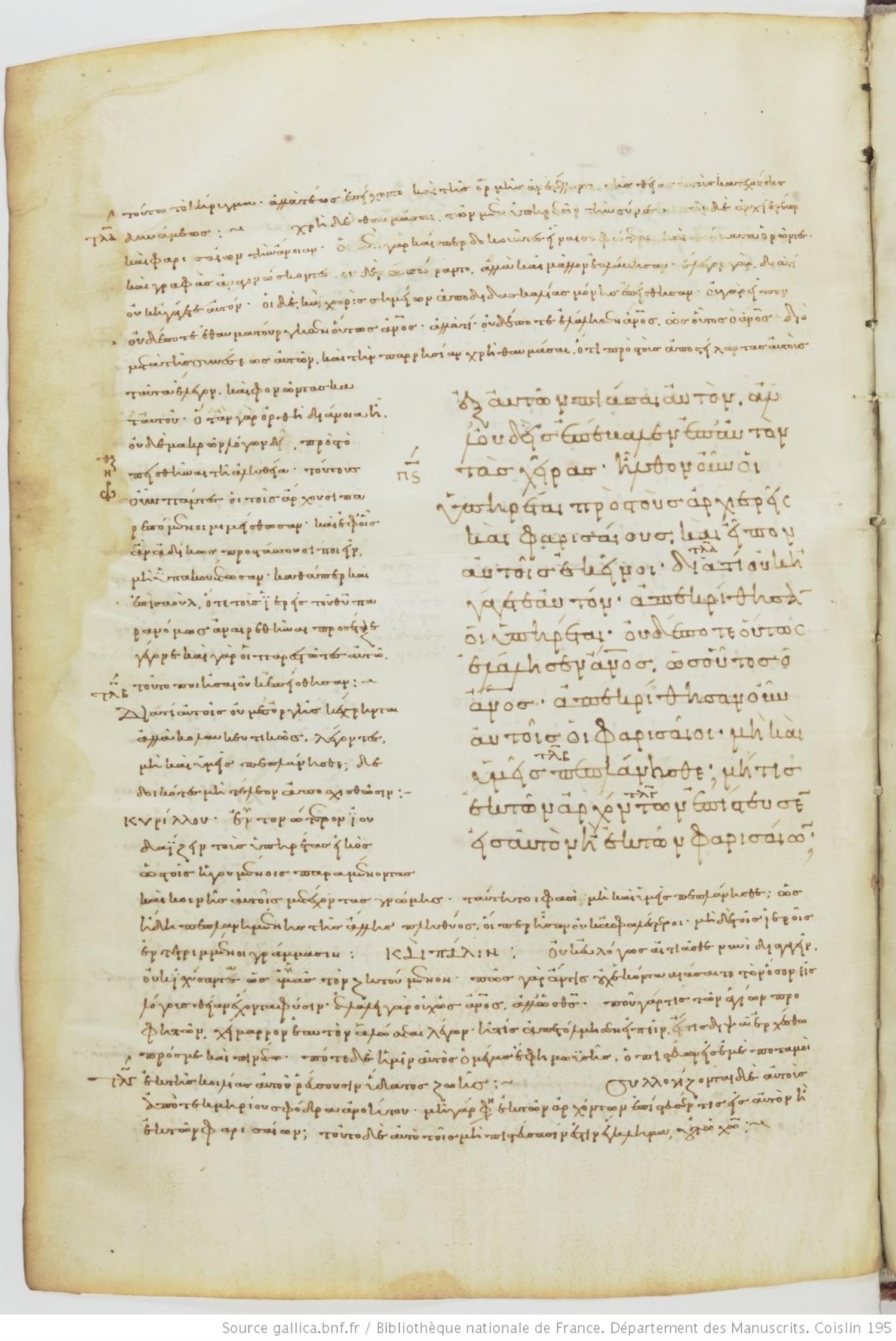 Tenth-century minuscule of the Gospels with commentary on parchment; 469 leaves, 1 column, varying number of lines per column. Images are made available by the Bilbiothèque Nationale. For recent images, please visit BNF Gallica.