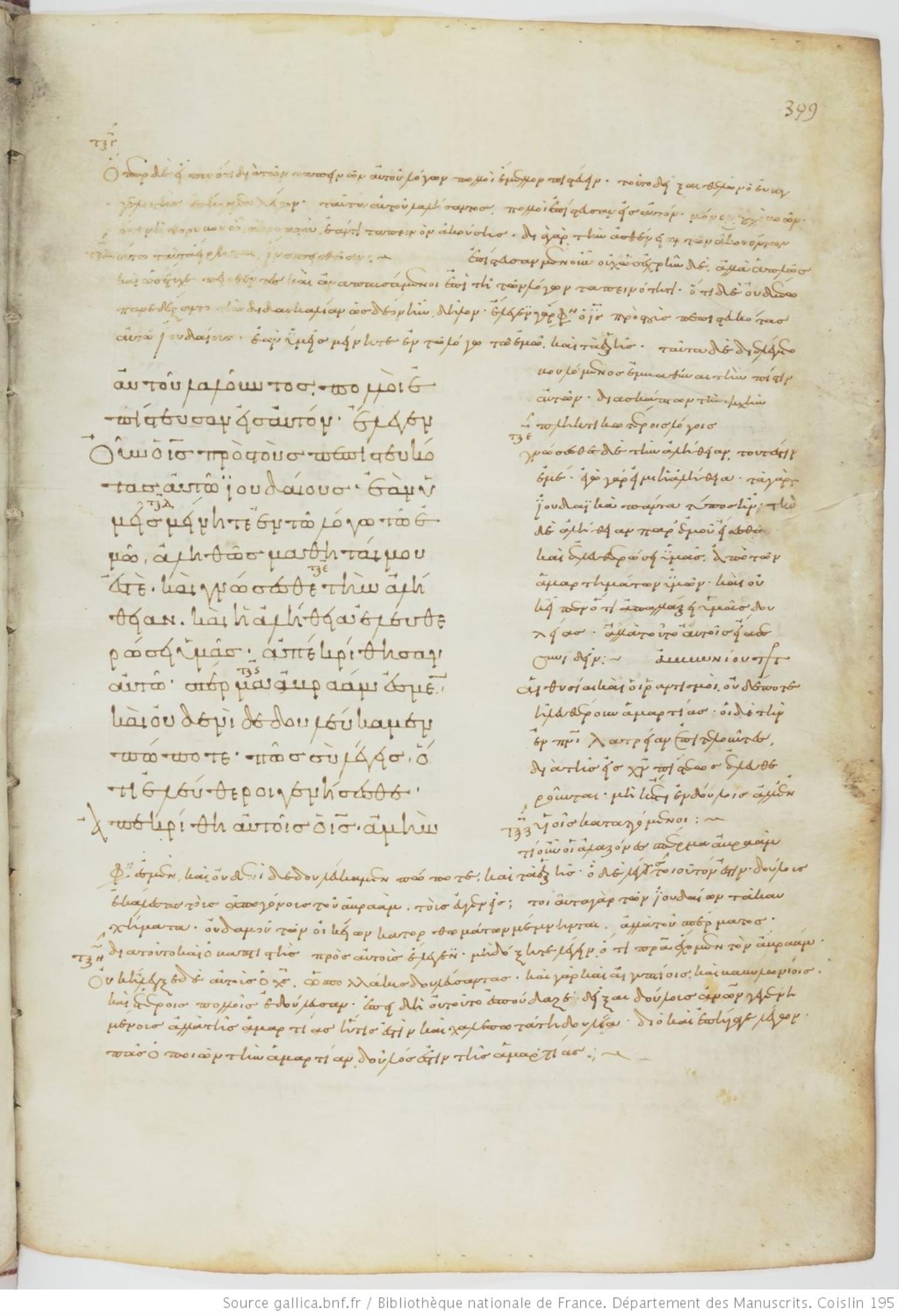 Tenth-century minuscule of the Gospels with commentary on parchment; 469 leaves, 1 column, varying number of lines per column. Images are made available by the Bilbiothèque Nationale. For recent images, please visit BNF Gallica.
