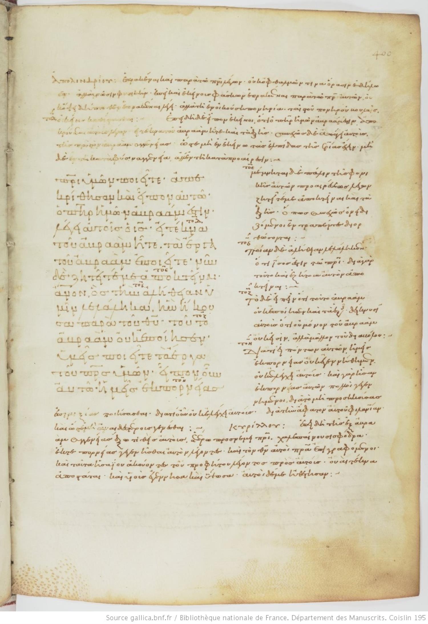Tenth-century minuscule of the Gospels with commentary on parchment; 469 leaves, 1 column, varying number of lines per column. Images are made available by the Bilbiothèque Nationale. For recent images, please visit BNF Gallica.