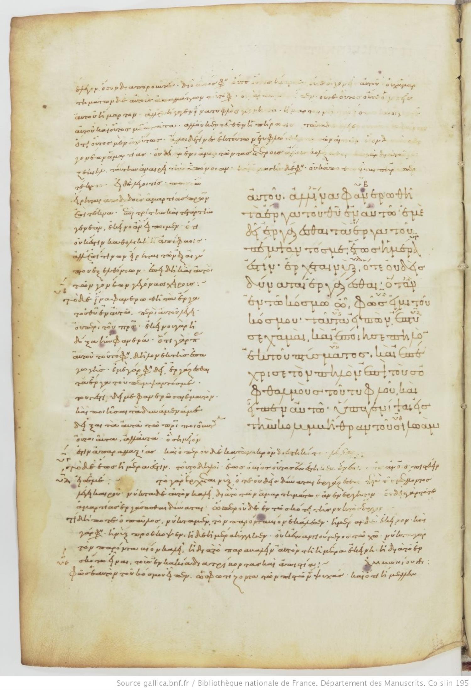 Tenth-century minuscule of the Gospels with commentary on parchment; 469 leaves, 1 column, varying number of lines per column. Images are made available by the Bilbiothèque Nationale. For recent images, please visit BNF Gallica.