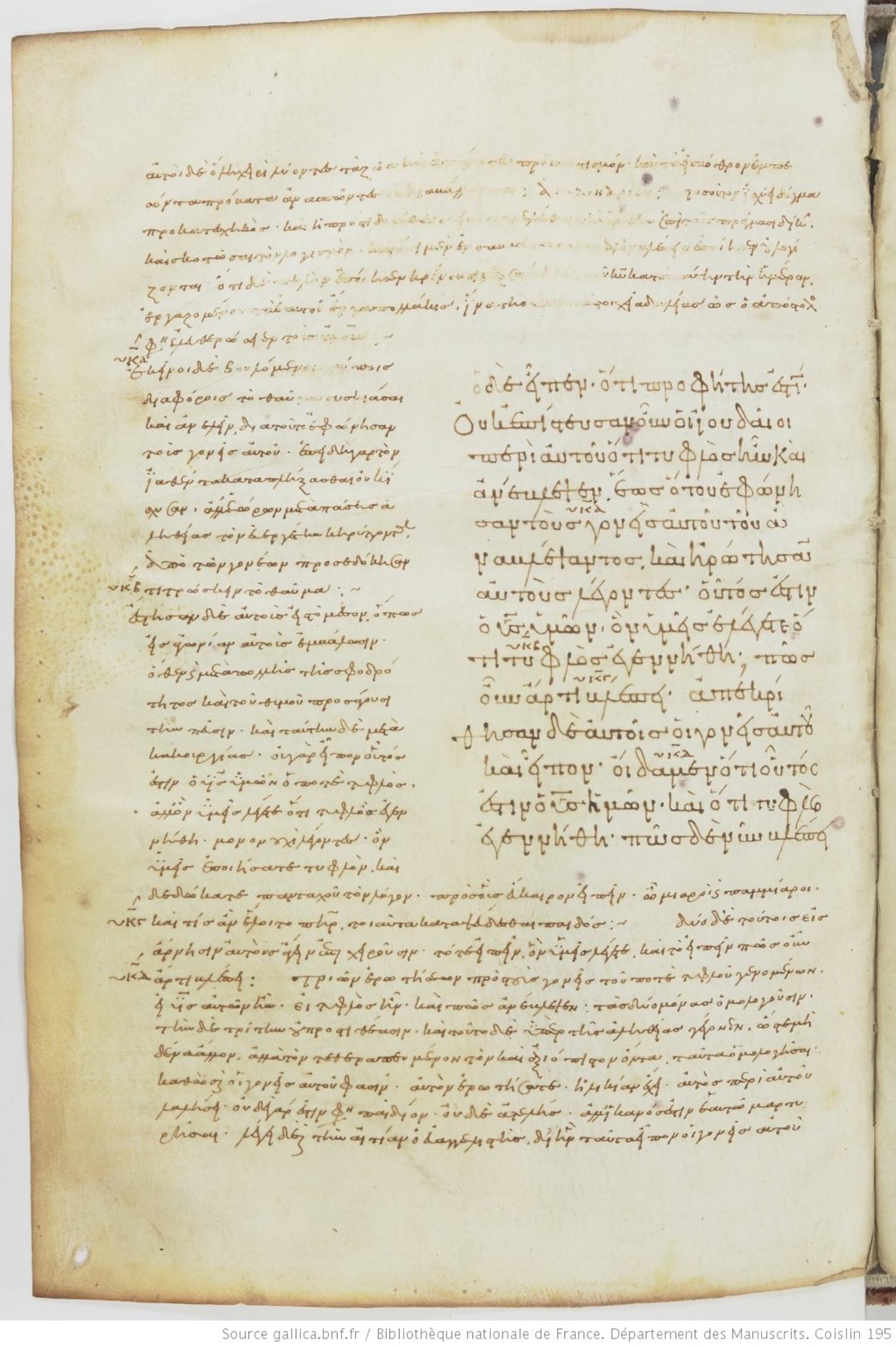Tenth-century minuscule of the Gospels with commentary on parchment; 469 leaves, 1 column, varying number of lines per column. Images are made available by the Bilbiothèque Nationale. For recent images, please visit BNF Gallica.