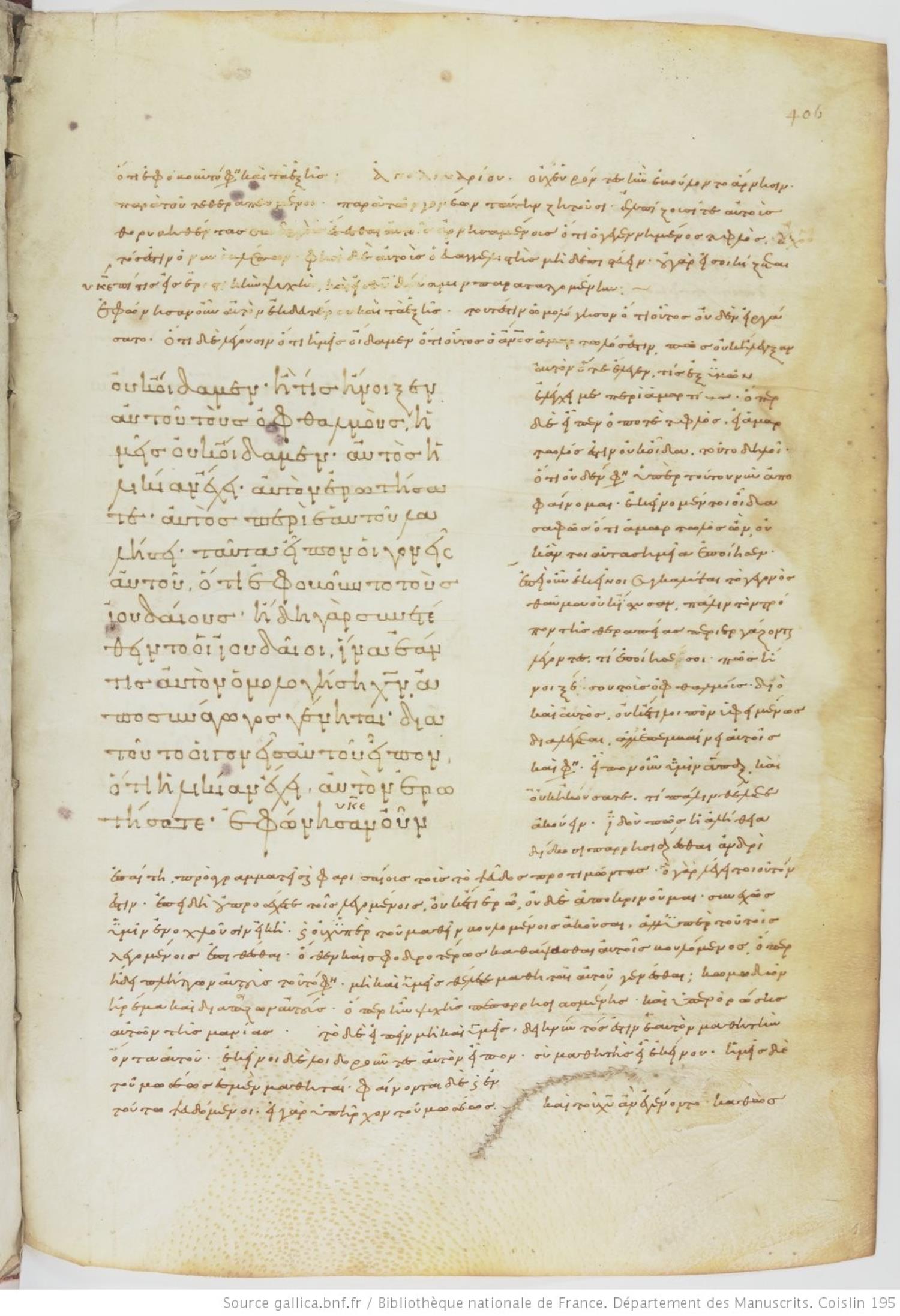 Tenth-century minuscule of the Gospels with commentary on parchment; 469 leaves, 1 column, varying number of lines per column. Images are made available by the Bilbiothèque Nationale. For recent images, please visit BNF Gallica.