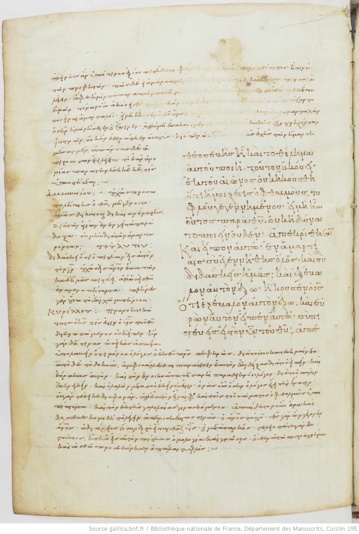 Tenth-century minuscule of the Gospels with commentary on parchment; 469 leaves, 1 column, varying number of lines per column. Images are made available by the Bilbiothèque Nationale. For recent images, please visit BNF Gallica.