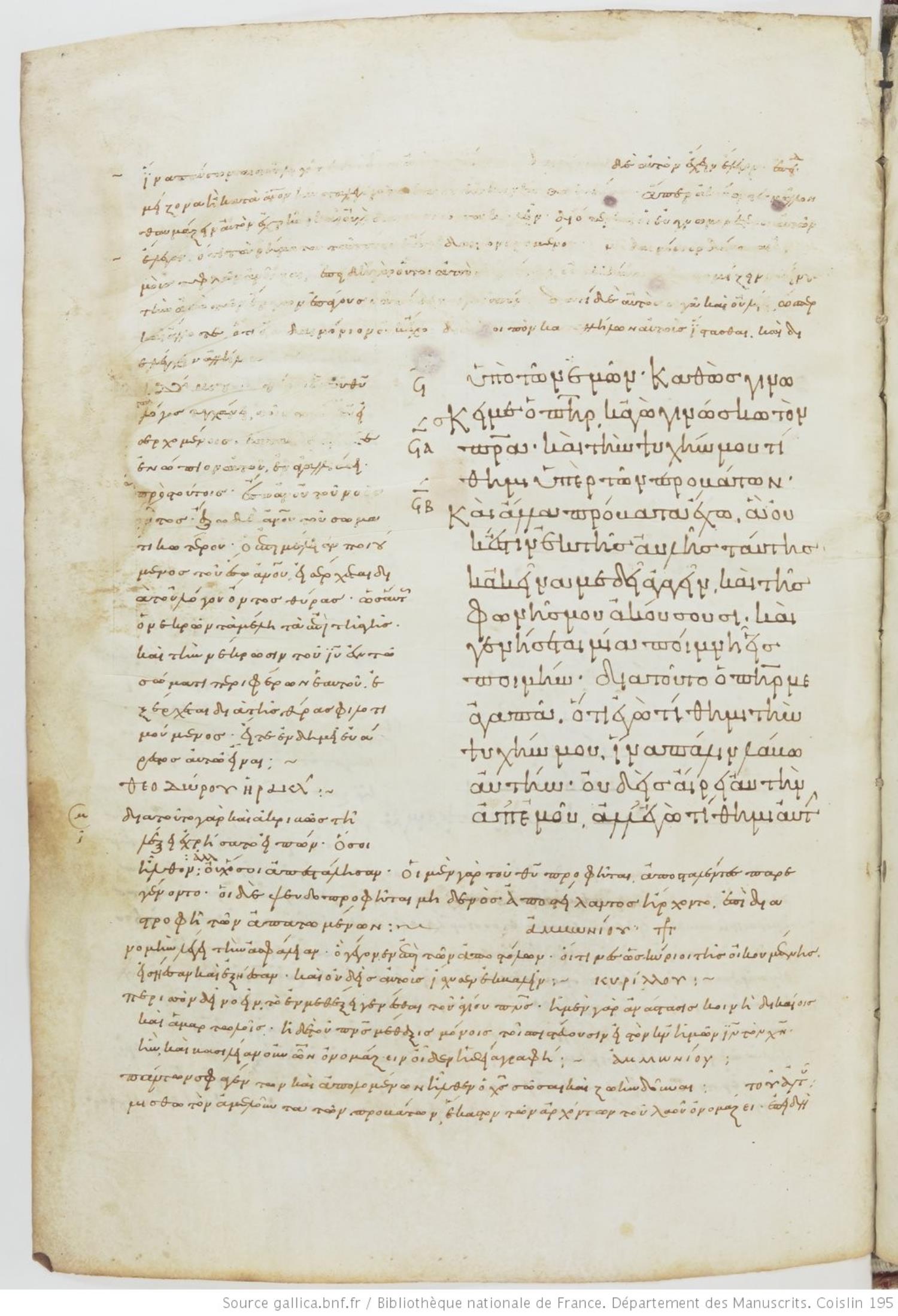 Tenth-century minuscule of the Gospels with commentary on parchment; 469 leaves, 1 column, varying number of lines per column. Images are made available by the Bilbiothèque Nationale. For recent images, please visit BNF Gallica.