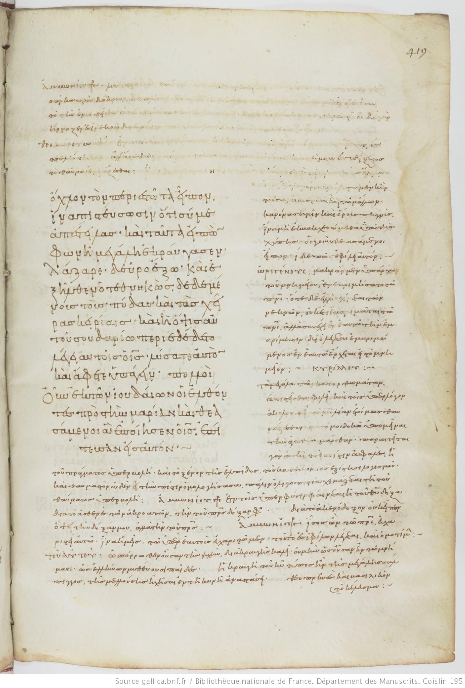 Tenth-century minuscule of the Gospels with commentary on parchment; 469 leaves, 1 column, varying number of lines per column. Images are made available by the Bilbiothèque Nationale. For recent images, please visit BNF Gallica.