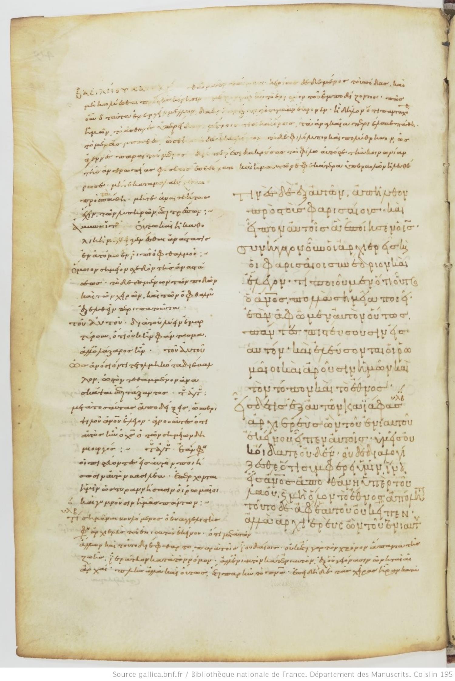 Tenth-century minuscule of the Gospels with commentary on parchment; 469 leaves, 1 column, varying number of lines per column. Images are made available by the Bilbiothèque Nationale. For recent images, please visit BNF Gallica.