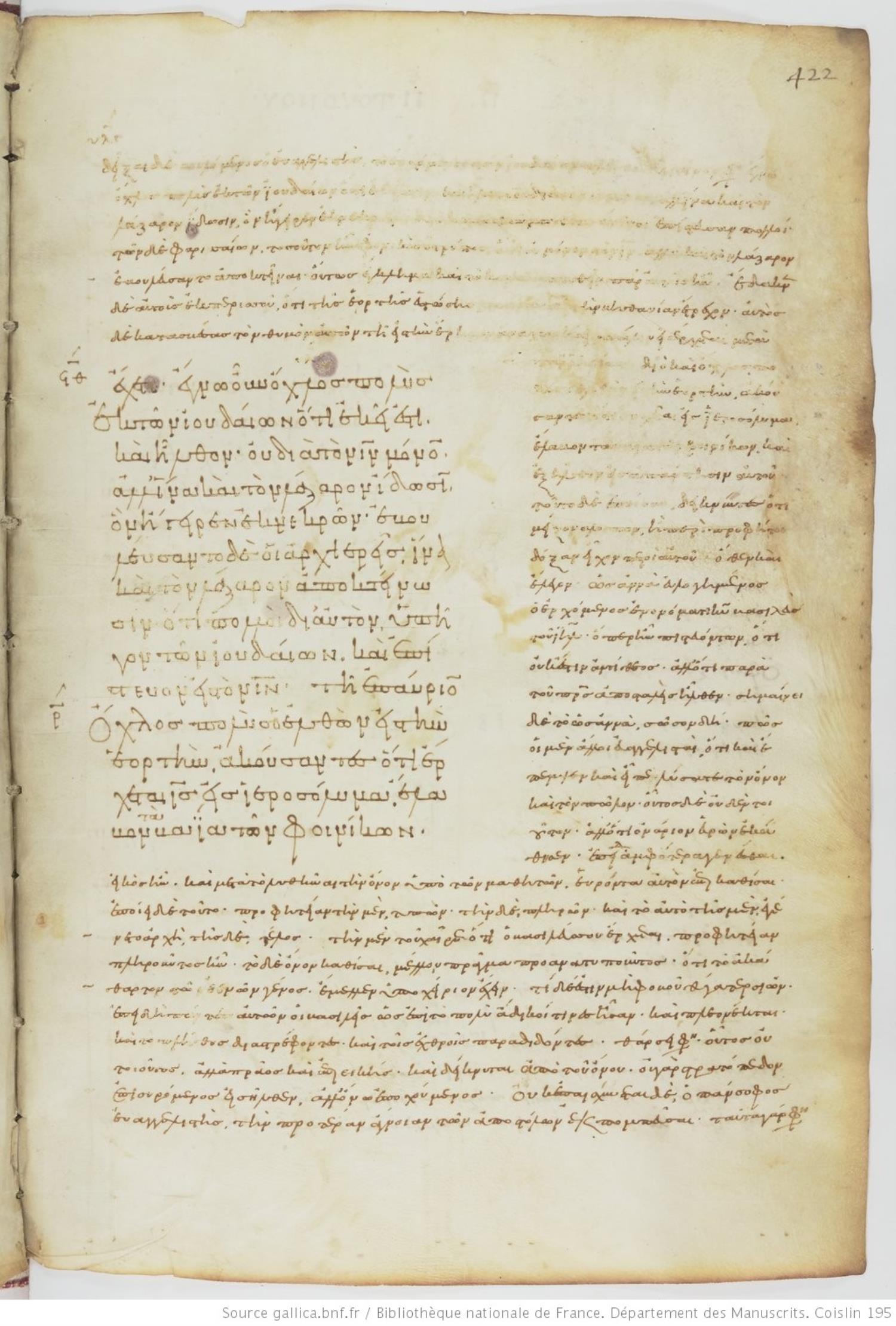 Tenth-century minuscule of the Gospels with commentary on parchment; 469 leaves, 1 column, varying number of lines per column. Images are made available by the Bilbiothèque Nationale. For recent images, please visit BNF Gallica.